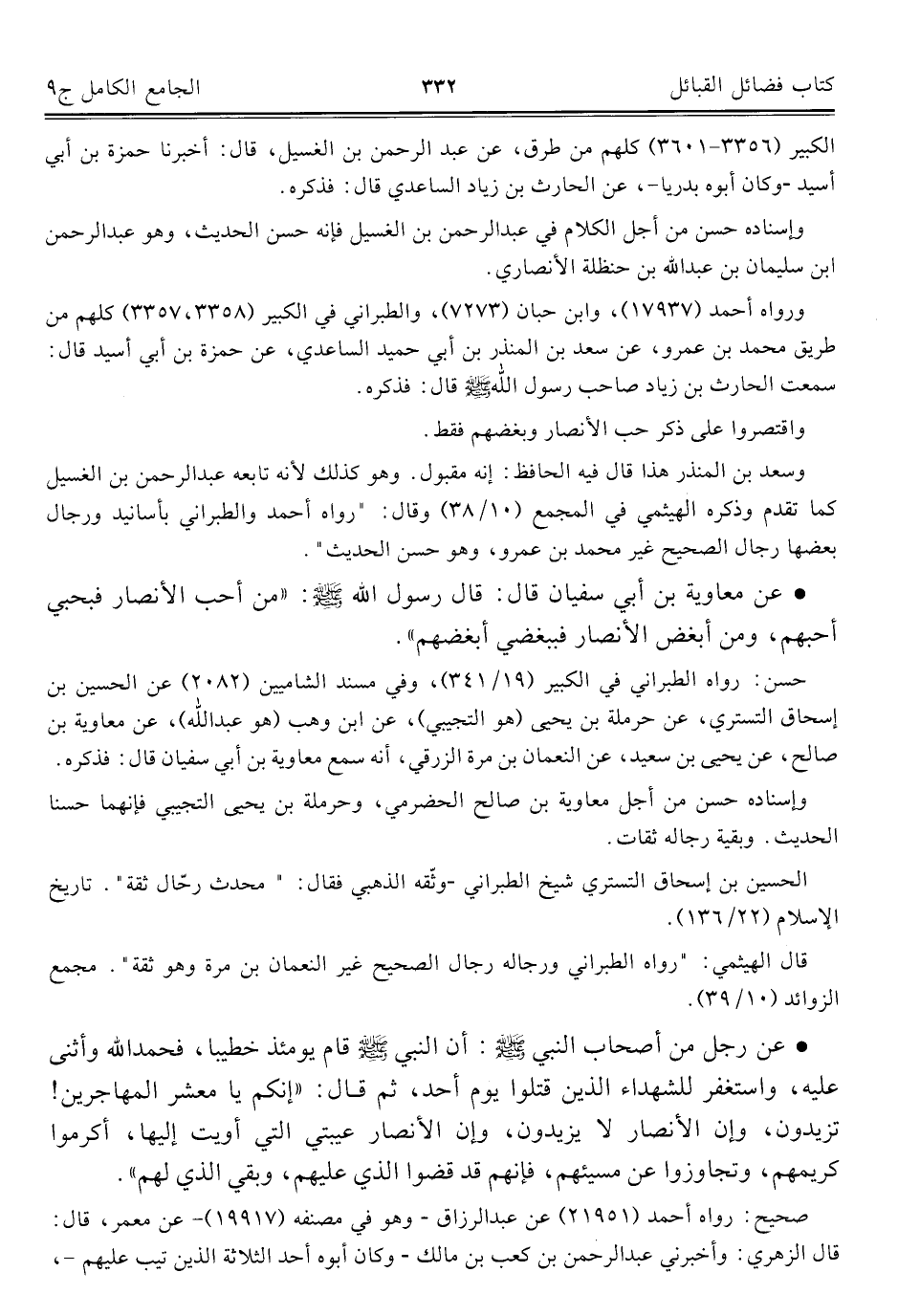 • عن معاوية بن أبي سفيان قال: قال رسول الله - صلى الله عليه وسلم -: "من أحب الأنصار فبحبي أحبهم، ومن أبغض الأنصار فببغضي أبغضهم".
