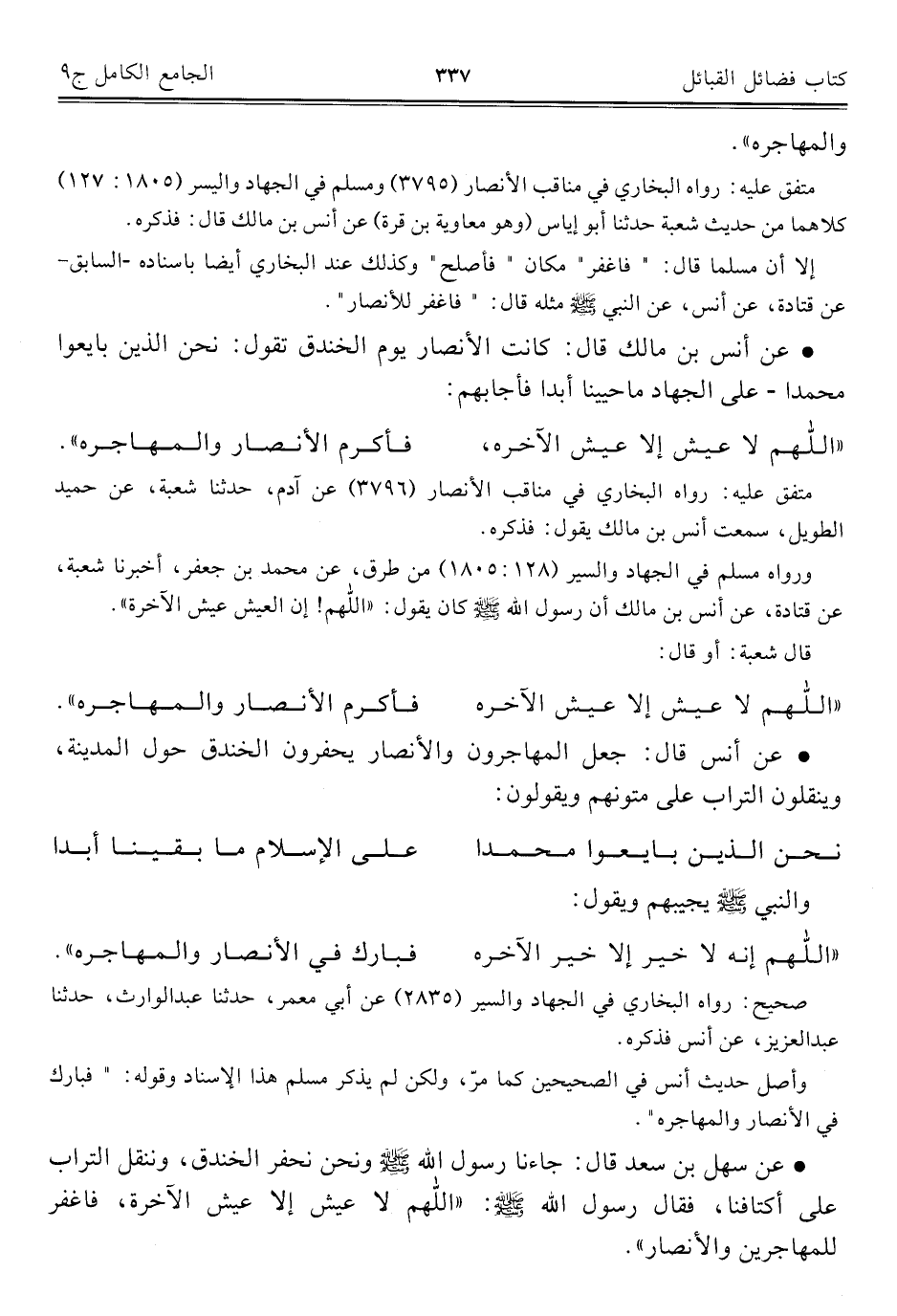 ورواه مسلم في الجهاد والسير (١٢٨: ١٨٠٥) من طرق، عن محمد بن جعفر، أخبرنا شعبة، عن قتادة، عن أنس بن مالك أن رسول الله - صلى الله عليه وسلم - كان يقول: "اللهم! إن العيش عيش الآخرة".