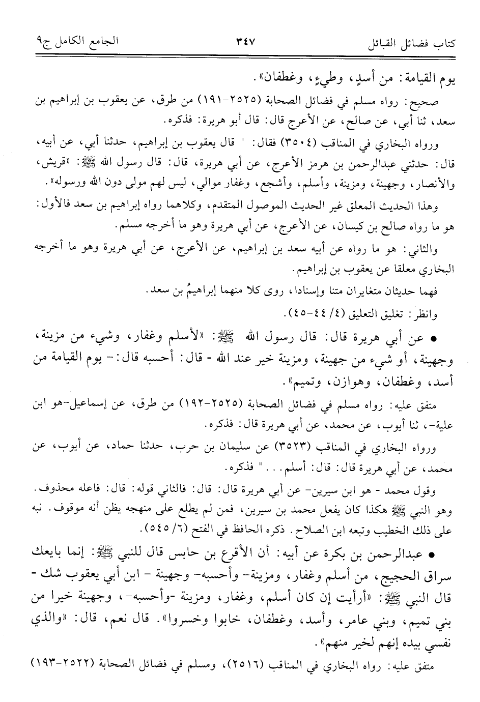 • عن أبي هريرة قال: قال رسول الله - صلى الله عليه وسلم -: "لأسلم وغفار، وشيء من مزينة، وجهينة، أو شيء من جهينة، ومزينة خير عند الله - قال: أحسبه قال: - يوم القيامة من أسد، وغطفان، وهوازن، وتميم".