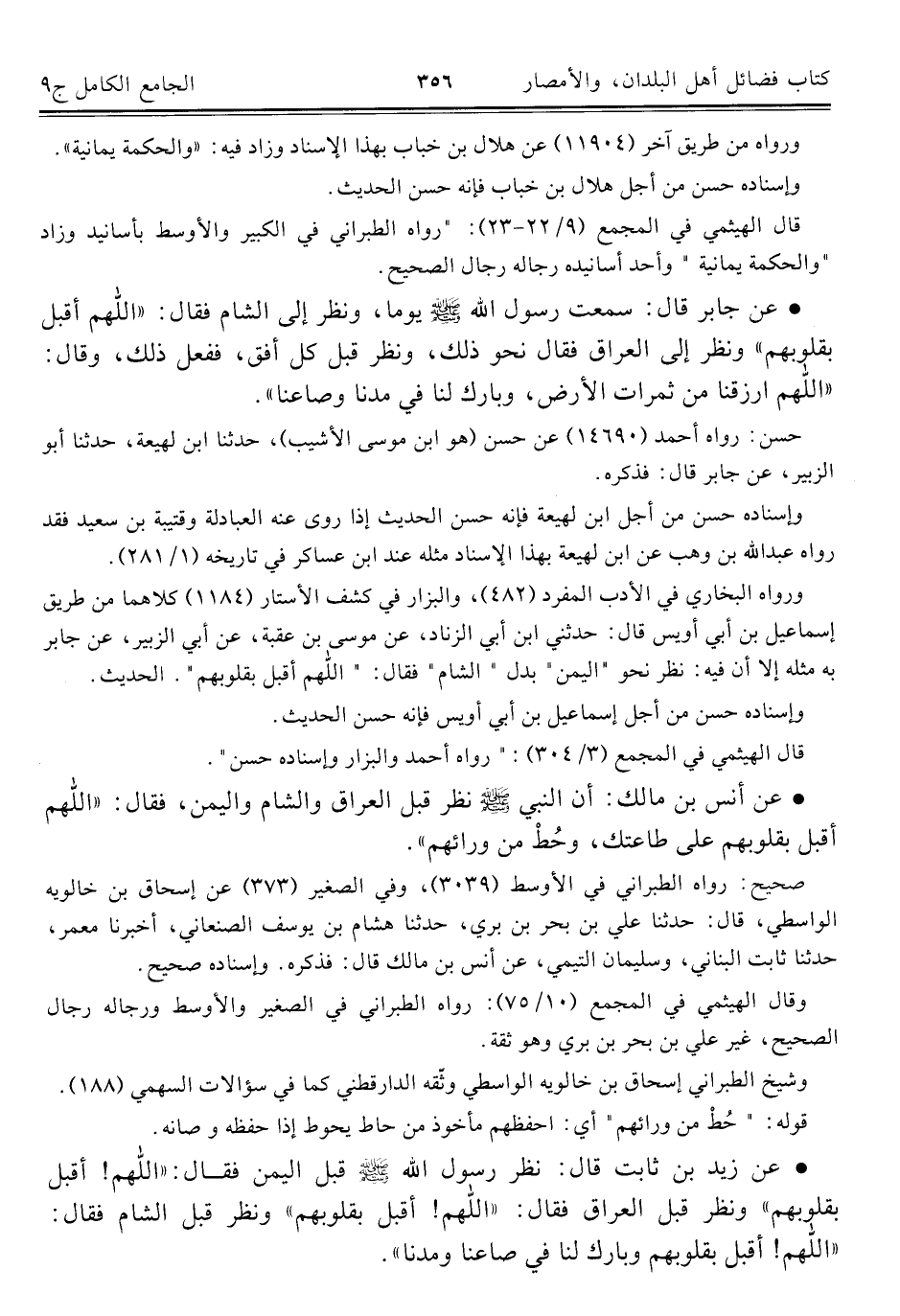 • عن زيد بن ثابت قال: نظر رسول الله - صلى الله عليه وسلم - قبل اليمن فقال: "اللهم! أقبل بقلوبهم" ونظر قبل العراق فقال: "اللهم! أقبل بقلوبهم" ونظر قبل الشام فقال: "اللهم! أقبل بقلوبهم وبارك لنا في صاعنا ومدنا".