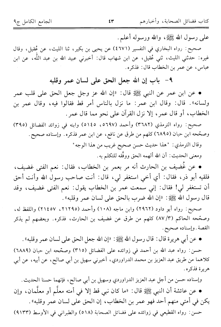 • عن ابن عمر عن النبي - صلى الله عليه وسلم - قال: "إن الله عز وجل جعل الحق على قلب عمر ولسانه". قال: وقال ابن عمر: ما نزل بالناس أمر قط فقالوا فيه، وقال عمر بن الخطاب، أو قال عمر، إلا نزل القرآن على نحو مما قال عمر.
