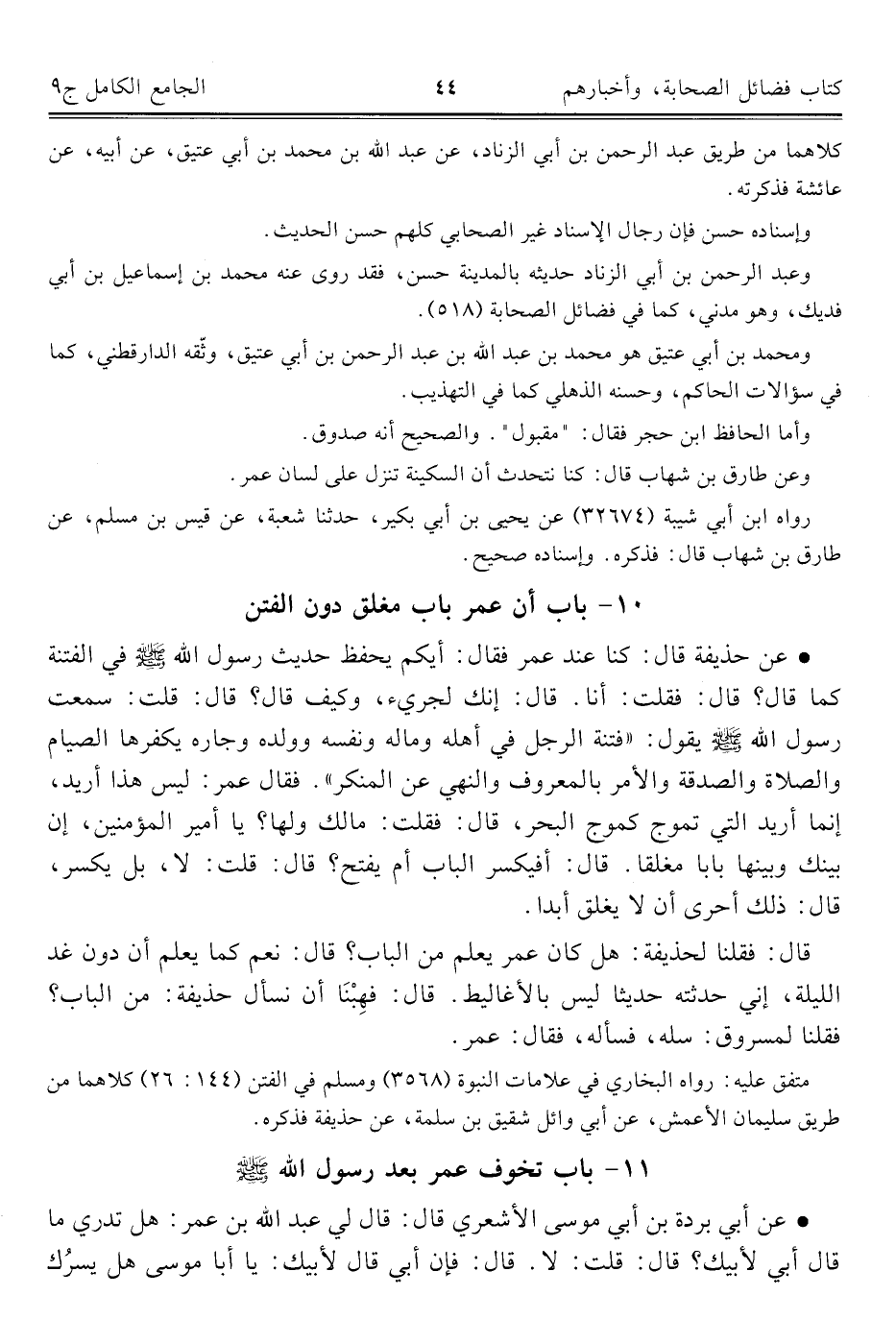قال: فقلنا لحذيفة: هل كان عمر يعلم من الباب؟ قال: نعم كما يعلم أن دون غد الليلة، إني حدثته حديثا ليس بالأغاليط. قال: فهِبْنَا أن نسأل حذيفة: من الباب؟ فقلنا لمسروق: سله، فسأله، فقال: عمر.