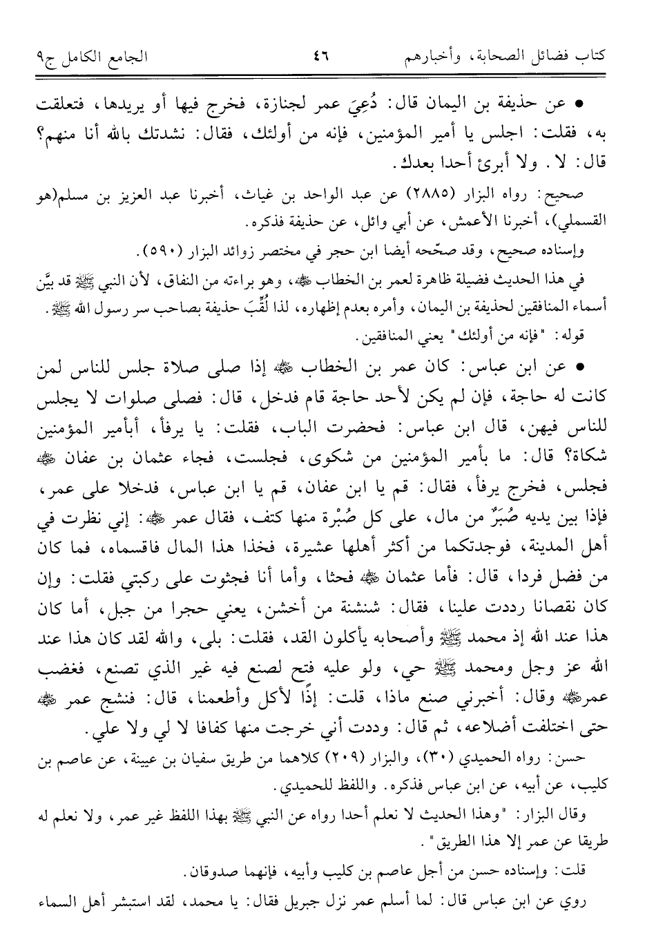 • عن حذيفة بن اليمان قال: دُعِيَ عمر لجنازة، فخرج فيها أو يريدها، فتعلقت به، فقلت: اجلس يا أمير المؤمنين، فإنه من أولئك، فقال: نشدتك بالله أنا منهم؟ قال: لا. ولا أبرئ أحدا بعدك.