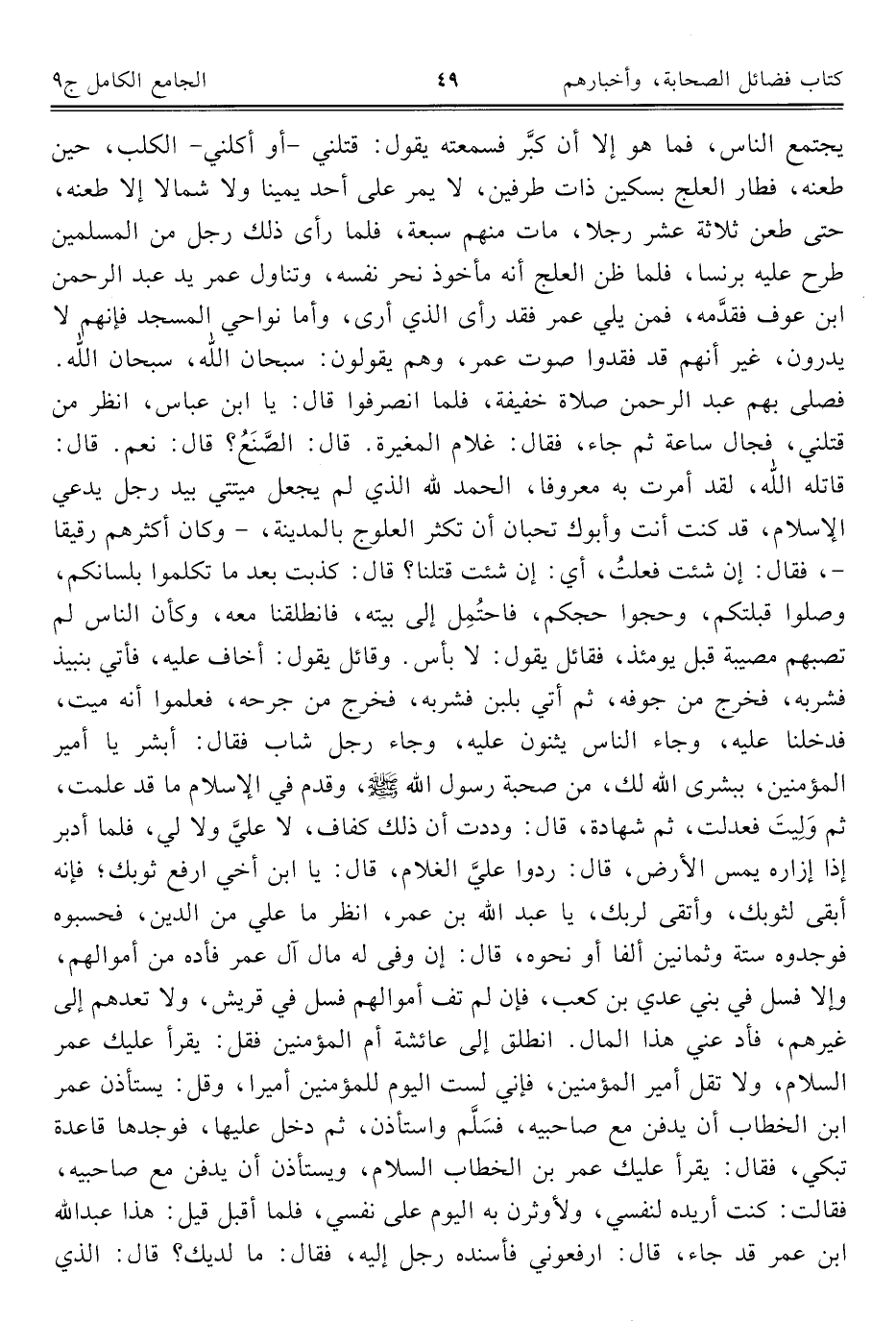 يجتمع الناس، فما هو إلا أن كبَّر فسمعته يقول: قتلني -أو أكلني- الكلب، حين طعنه، فطار العلج بسكين ذات طرفين، لا يمر على أحد يمينا ولا شمالا إلا طعنه، حتى طعن ثلاثة عشر رجلا، مات منهم سبعة، فلما رأق ذلك رجل من المسلمين طرح عليه برنسا، فلما ظن العلج أنه مأخوذ نحر نفسه، وتناول عمر يد عبد الرحمن ابن عوف فقدَّمه، فمن يلي عمر فقد رأى الذي أرى، وأما نواحي المسجد فإنهم لا يدرون، غير أنهم قد فقدوا صوت عمر، وهم يقولون: سبحان الله، سبحان الله. فصلى بهم عبد الرحمن صلاة خفيفة، فلما انصرفوا قال: يا ابن عباس، انظر من قتلني، فجال ساعة ثم جاء، فقال: غلام المغيرة. قال: الصَّنَعُ؟ قال: نعم. قال: قاتله الله، لقد أمرت به معروفا، الحمد لله الذي لم يجعل ميتتي بيد رجل يدعي الإسلام، قد كنت أنت وأبوك تحبان أن تكثر العلوج بالمدينة، -وكان أكثرهم رقيقا-، فقال: إن شئت فعلتُ، أي: إن شئت قتلنا؟ قال: كذبت بعد ما تكلموا بلسانكم، وصلوا قبلتكم، وحجوا حجكم، فاحتُمِل إلى بيته، فانطلقنا معه، وكأن الناس لم تصبهم مصيبة قبل يومئذ، فقائل يقول: لا بأس. وقائل يقول: أخاف عليه، فأتي بنبيذ فشربه، فخرج من جوفه، ثم أتي بلبن فشربه، فخرج من جرحه، فعلموا أنه ميت، فدخلنا عليه، وجاء الناس يثنون عليه، وجاء رجل شاب فقال: أبشر يا أمير المؤمنين، ببشرى الله لك، من صحبة رسول الله - صلى الله عليه وسلم -، وقدم في الإسلام ما قد علمت، ثم وَلِيتَ فعدلت، ثم شهادة، قال: وددت أن ذلك كفاف، لا عليَّ ولا لي، فلما أدبر إذا إزاره يمس الأرض، قال: ردوا عليَّ الغلام، قال: يا ابن أخي ارفع ثوبك؛ فإنه أبقى لثوبك، وأتقى لربك، يا عبد الله بن عمر، انظر ما علي من الدين، فحسبوه فوجدوه ستة وثمانين ألفا أو نحوه، قال: إن وفى له مال آل عمر فأده من أموالهم، وإلا فسل في بني عدي بن كعب، فإن لم تف أموالهم فسل في قريش، ولا تعدهم إلى غيرهم، فأد عني هذا المال. انطلق إلى عائشة أم المؤمنين فقل: يقرأ عليك عمر السلام، ولا تقل أمير المؤمنين، فإني لست اليوم للمؤمنين أميرا، وقل: يستأذن عمر ابن الخطاب أن يدفن مع صاحبيه، فسَلَّم واستأذن، ثم دخل عليها، فوجدها قاعدة تبكي، فقال: يقرأ عليك عمر بن الخطاب السلام، ويستأذن أن يدفن مع صاحبيه، فقالت: كنت أريده لنفسي، ولأوثرن به اليوم على نفسي، فلما أقبل قيل: هذا عبد الله ابن عمر قد جاء، قال: ارفعوني فأسنده رجل إليه، فقال: ما لديك؟ قال: الذي