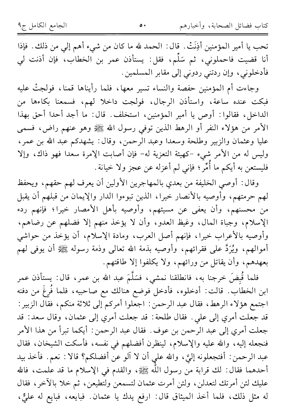 وجاءت أم المؤمنين حفصة والنساء تسير معها، فلما رأيناها قمنا، فولجتْ عليه فبكت عنده ساعة، واستأذدن الرجال، فولجت داخلا لهم، فسمعنا بكاءها من الداخل، فقالوا: أوص يا أمير المؤمنين، استخلف. قال: ما أجد أحدا أحق بهذا الأمر من هؤلاء النفر أو الرهط الذين توفي رسول الله - صلى الله عليه وسلم - وهو عنهم راض، فسمى عليا وعثمان والزبير وطلحة وسعدا وعبد الرحمن، وقال: يشهدكم عبد الله بن عمر، وليس له من الأمر شيء -كهيئة التعزية له- فإن أصابت الإمرة سعدا فهو ذاك، وإلا فليستعن به أيكم ما أُمِّر؛ فإني لم أعزله عن عجز ولا خيانة.
