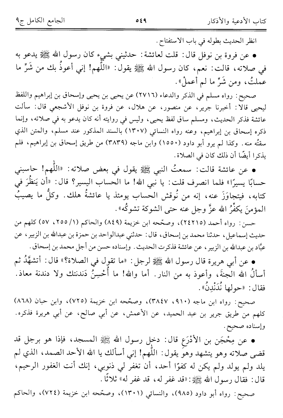 • عن فروة بن نوفل قال: قلت لعائشة: حدثيني بشيء كان رسول الله - صلى الله عليه وسلم - يدعو به في صلاته، قالت: نعم، كان رسول الله - صلى الله عليه وسلم - يقول: "اللَّهم! إني أعوذُ بك من شَرِّ ما عملتُ، ومن شَرِّ ما لم أعمل".