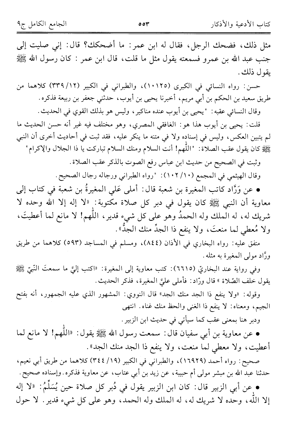• عن وَرَّاد كاتب المغيرة بن شعبة قال: أملى عَلي المغيرةُ بن شعبة في كتاب إلى معاوية أن النبي - صلى الله عليه وسلم - كان يقول في دبر كل صلاة مكتوبة: "لا إله إلا الله وحده لا شريك له، له الملك وله الحمدُ وهو على كل شيء قدير، اللَّهم! لا مانع لما أعطيتَ، ولا مُعطي لما منعتَ، ولا ينفع ذا الجدِّ منك الجدُّ".