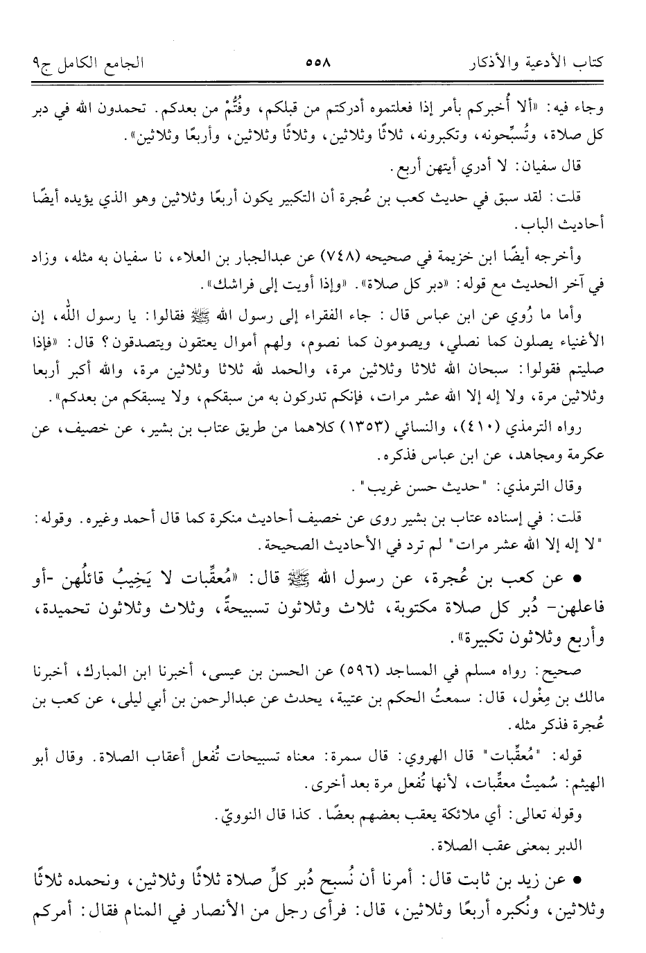 • عن كعب بن عُجرة، عن رسول الله - صلى الله عليه وسلم - قال: "مُعقِّبات لا يَخِيبُ قائلُهن - أو فاعلهن - دُبر كل صلاة مكتوبة، ثلاث وثلاثون تسبيحةً، وثلاث وثلاثون تحميدة، وأربع وثلاثون تكبيرة".