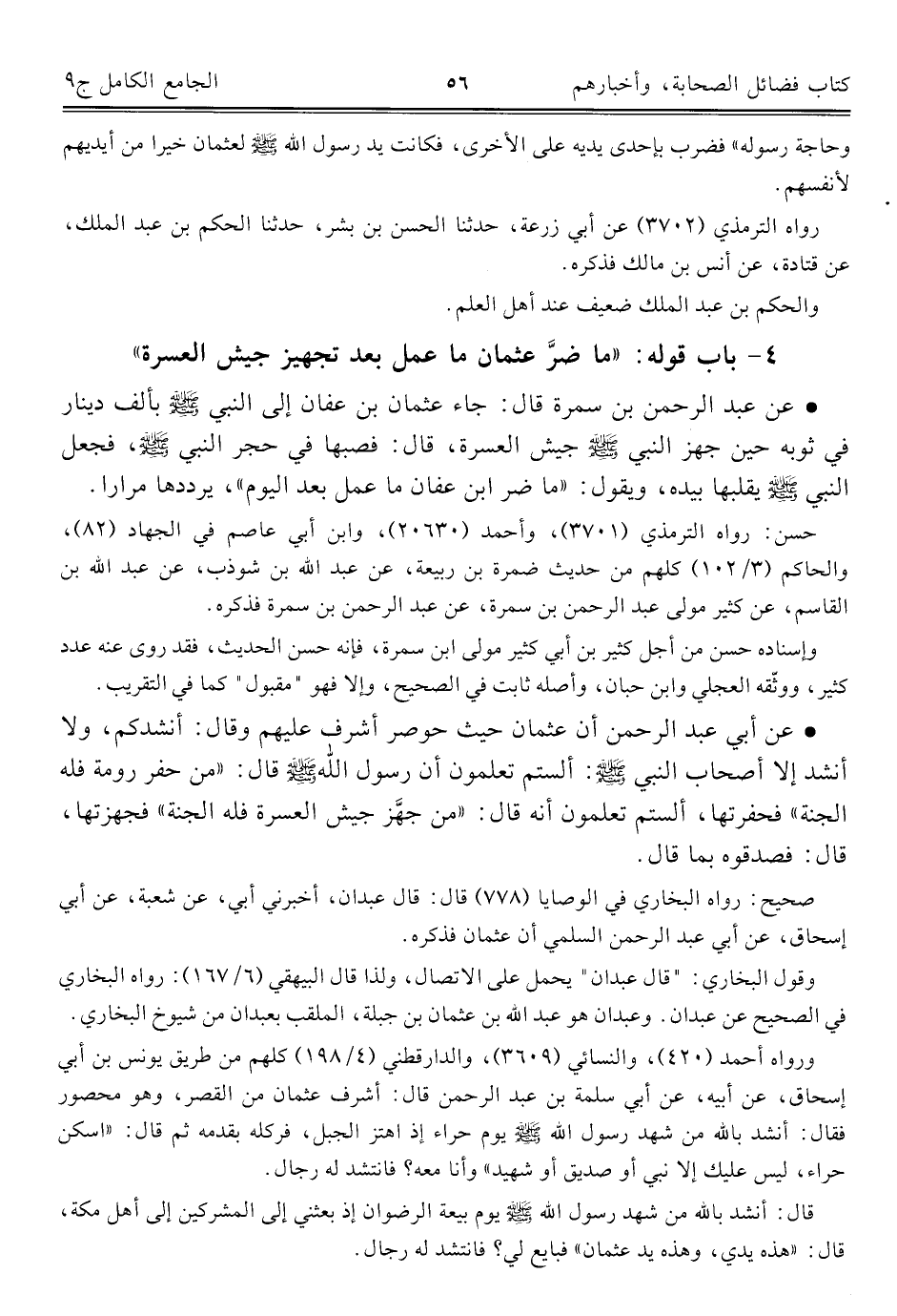 • عن أبي عبد الرحمن أن عثمان حيث حوصر أشرف عليهم وقال: أنشدكم، ولا أنشد إلا أصحاب النبي - صلى الله عليه وسلم -: ألستم تعلمون أن رسول الله - صلى الله عليه وسلم - قال: "من حفر رومة فله الجنة" فحفرتها، ألستم تعلمون أنه قال: "من جهَّز جيش العسرة فله الجنة" فجهزتها، قال: فصدقوه بما قال.