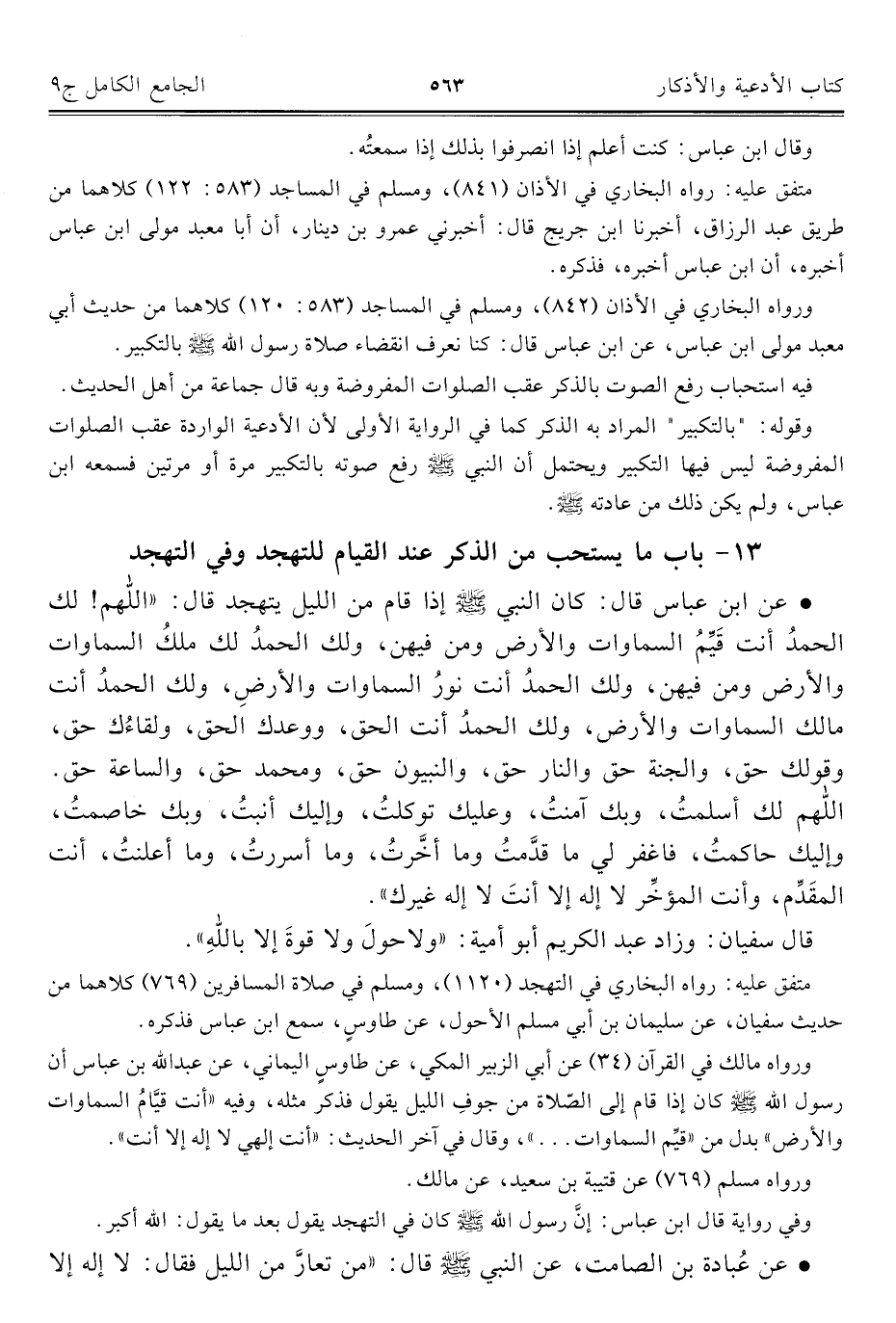 • عن ابن عباس قال: كان النبي - صلى الله عليه وسلم - إذا قام من الليل يتهجد قال: "اللَّهم! لك الحمدُ أنت قَيِّمُ السماوات والأرض ومن فيهن، ولك الحمدُ لك ملكُ السماوات والأرض ومن فيهن، ولك الحمدُ أنت نورُ السماوات والأرضِ، ولك الحمدُ أنت مالك السماوات والأرض، ولك الحمدُ أنت الحق، ووعدك الحق، ولقاءُك حق، وقولك حق، والجنة حق والنار حق، والنبيون حق، ومحمد حق، والساعة حق. اللَّهم لك أسلمتُ، وبك آمنتُ، وعليك توكلتُ، وإليك أنبتُ، وبك خاصمتُ، وإليك حاكمتُ، فاغفر لي ما قدَّمتُ وما أخَّرتُ، وما أسررتُ، وما أعلنتُ، أنت المقَدِّم، وأنت المؤخِّر لا إله إلا أنتَ لا إله غيرك".