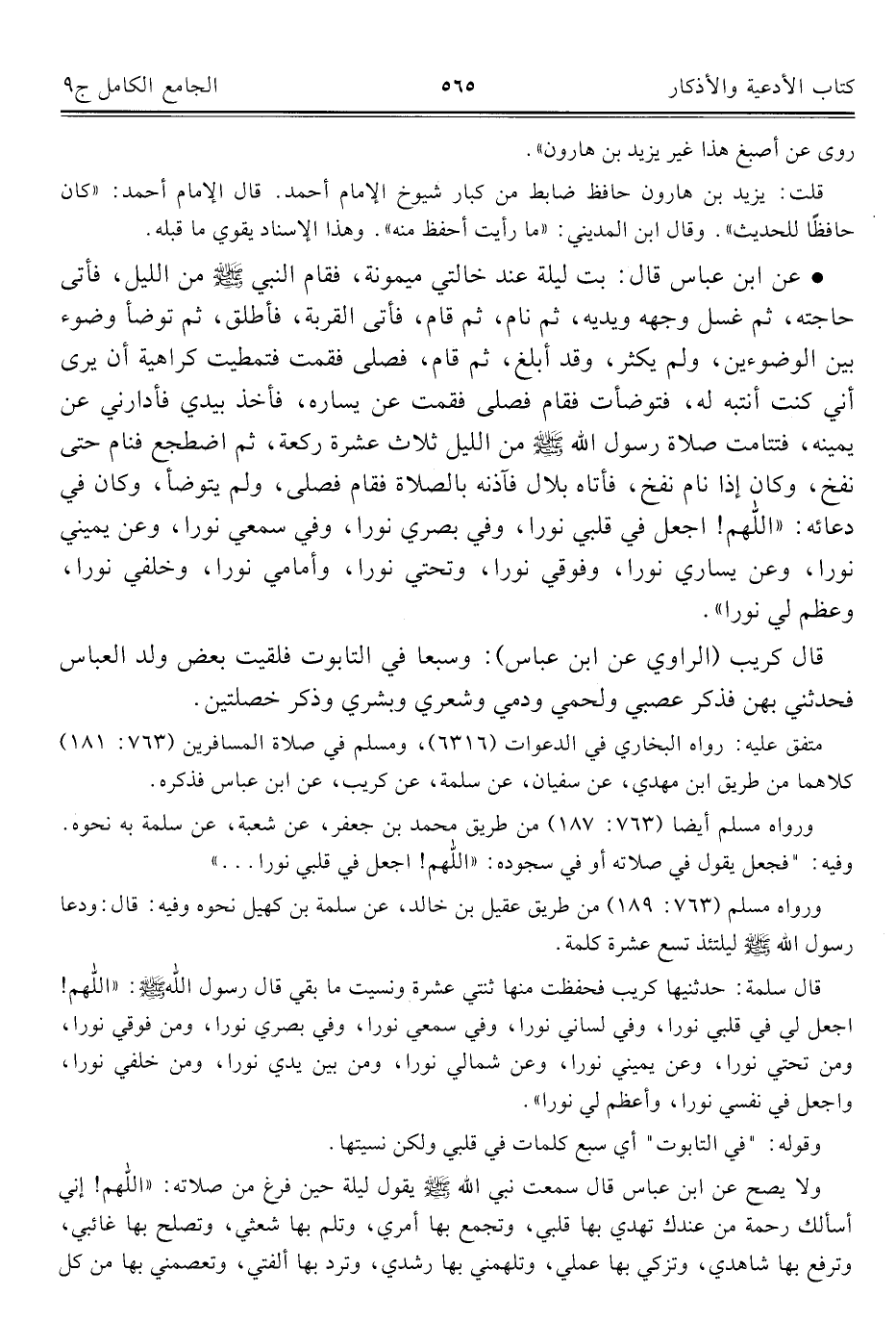 • عن ابن عباس قال: بت ليلة عند خالتي ميمونة، فقام النبي - صلى الله عليه وسلم - من الليل، فأتى حاجته، ثم غسل وجهه ويديه، ثم نام، ثم قام، فأتى القربة، فأطلق، ثم توضأ وضوء بين الوضوءين، ولم يكثر، وقد أبلغ، ثم قام، فصلى فقمت فتمطيت كراهية أن يرى أني كنت أنتبه له، فتوضأت فقام فصلى فقمت عن يساره، فأخذ بيدي فأدارني عن يمينه، فتتامت صلاة رسول الله - صلى الله عليه وسلم - من الليل ثلاث عشرة ركعة، ثم اضطجع فنام حتى نفخ، وكان إذا نام نفخ، فأتاه بلال فآذنه بالصلاة فقام فصلى، ولم يتوضأ، وكان في دعائه: "اللَّهم! اجعل في قلبي نورا، وفي بصري نورا، وفي سمعي نورا، وعن يميني نورا، وعن يساري نورا، وفوقي نورا، وتحتي نورا، وأمامي نورا، وخلفي نورا، وعظم لي نورا".
