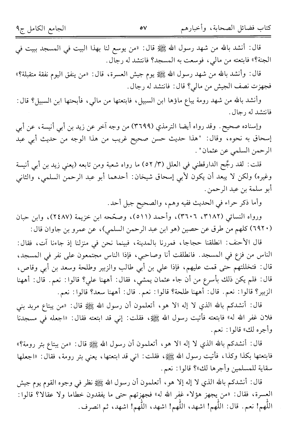 قال: أنشدكم بالله الذي لا إله الا هو، أتعلمون أن رسول الله - صلى الله عليه وسلم - قال: "من يبتاع مربد بني فلان غفر الله له" فابتعته فأتيت رسول الله - صلى الله عليه وسلم -، فقلت: إني قد ابتعته فقال: "اجعله في مسجدنا وأجره لك" قالوا: نعم.