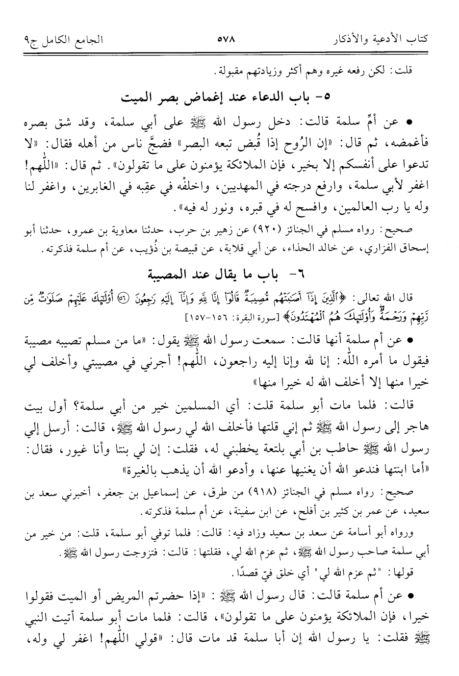 • عن أم سلمة أنها قالت: سمعت رسول الله - صلى الله عليه وسلم - يقول: "ما من مسلم تصيبه مصيبة فيقول ما أمره الله: إنا لله وإنا إليه راجعون، اللَّهم! أجرني في مصيبتي وأخلف لي خيرا منها إلا أخلف الله له خيرا منها".