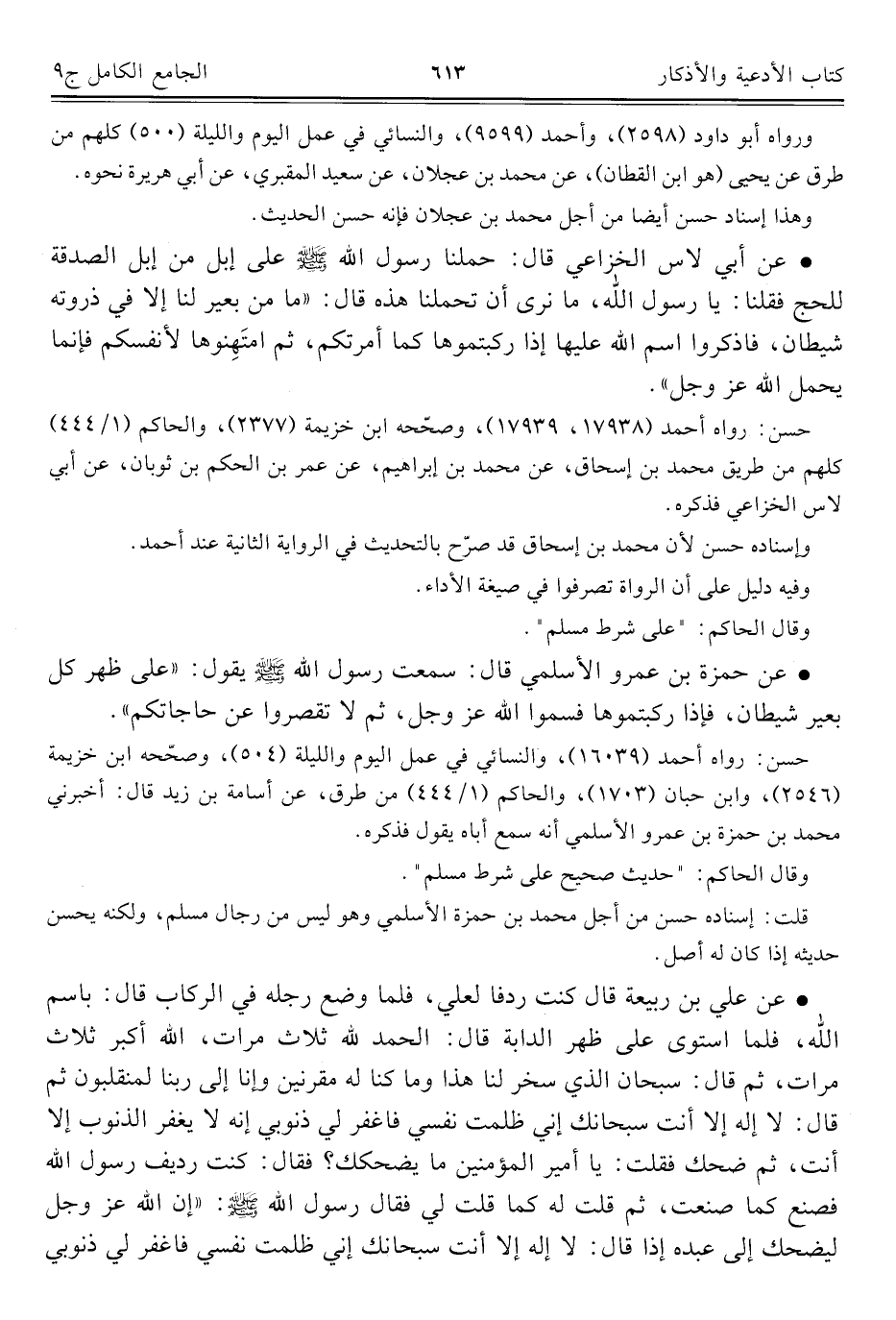 • عن علي بن ربيعة قال كنت ردفا لعلي، فلما وضع رجله في الركاب قال: باسم الله، فلما استوى على ظهر الدابة قال: الحمد لله ثلاث مرات، الله أكبر ثلاث مرات، ثم قال: سبحان الذي سخر لنا هذا وما كنا له مقرنين وإنا إلى ربنا لمنقلبون ثم قال: لا إله إلا أنت سبحانك إني ظلمت نفسي فاغفر لي ذنوبي إنه لا يغفر الذنوب إلا أنت، ثم ضحك فقلت: يا أمير المؤمنين ما يضحكك؟ فقال: كنت رديف رسول الله فصنع كما صنعت، ثم قلت له كما قلت لي فقال رسول الله - صلى الله عليه وسلم -: "إن الله عز وجل ليضحك إلى عبده إذا قال: لا إله إلا أنت سبحانك إني ظلمت نفسي فاغفر لي ذنوبي