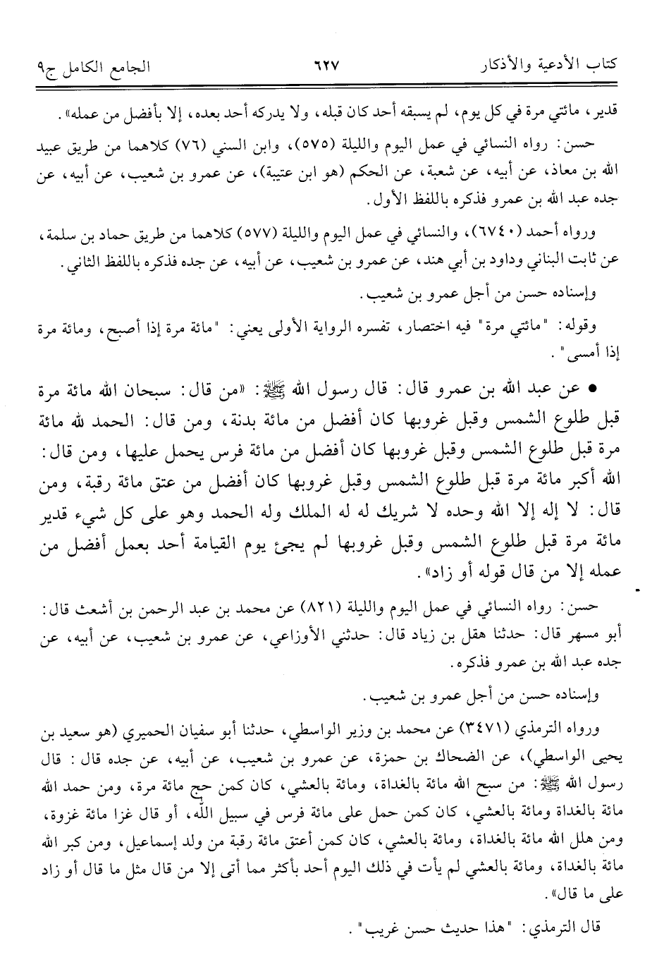 ورواه الترمذي (٣٤٧١) عن محمد بن وزير الواسطي، حدثنا أبو سفيان الحميري (هو سعيد بن يحيى الواسطي)، عن الضحاك بن حمزة، عن عمرو بن شعيب، عن أبيه، عن جده قال: قال رسول الله - صلى الله عليه وسلم -: من سبح الله مائة بالغداة، ومائة بالعشي، كان كمن حج مائة مرة، ومن حمد الله مائة بالغداة ومائة بالعشي، كان كمن حمل على مائة فرس في سبيل الله، أو قال غزا مائة غزوة، ومن هلل الله مائة بالغداة، ومائة بالعشي، كان كمن أعتق مائة رقبة من ولد إسماعيل، ومن كبر الله مائة بالغداة، ومائة بالعشي لم يأت في ذلك اليوم أحد بأكثر مما أتى إلا من قال مثل ما قال أو زاد على ما قال".