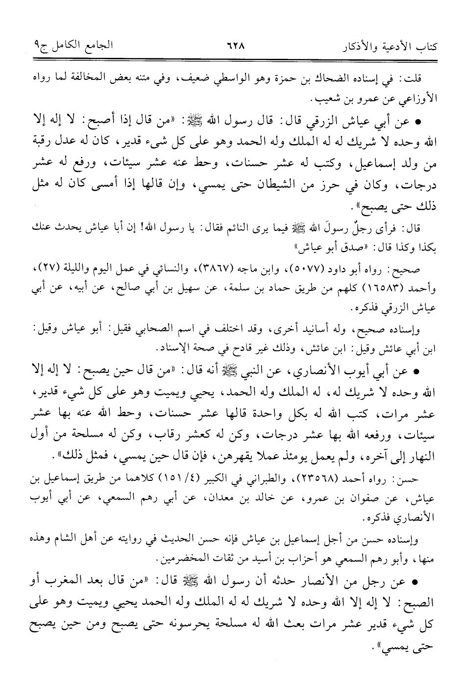 • عن أبي أيوب الأنصاري، عن النبي - صلى الله عليه وسلم - أنه قال: "من قال حين يصبح: لا إله إلا الله وحده لا شريك له، له الملك وله الحمد، يحيي ويميت وهو على كل شيء قدير، عشر مرات، كتب الله له بكل واحدة قالها عشر حسنات، وحط الله عنه بها عشر سيئات، ورفعه الله بها عشر درجات، وكن له كعشر رقاب، وكن له مسلحة من أول النهار إلى آخره، ولم يعمل يومئذ عملا يقهرهن، فإن قال حين يمسي، فمثل ذلك".