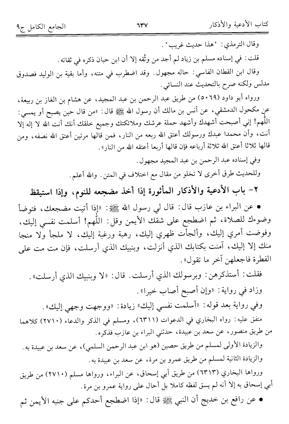 ٢ - باب الأدعية والأذكار المأثورة إذا أخذ مضجعه للنوم، وإذا استيقظ