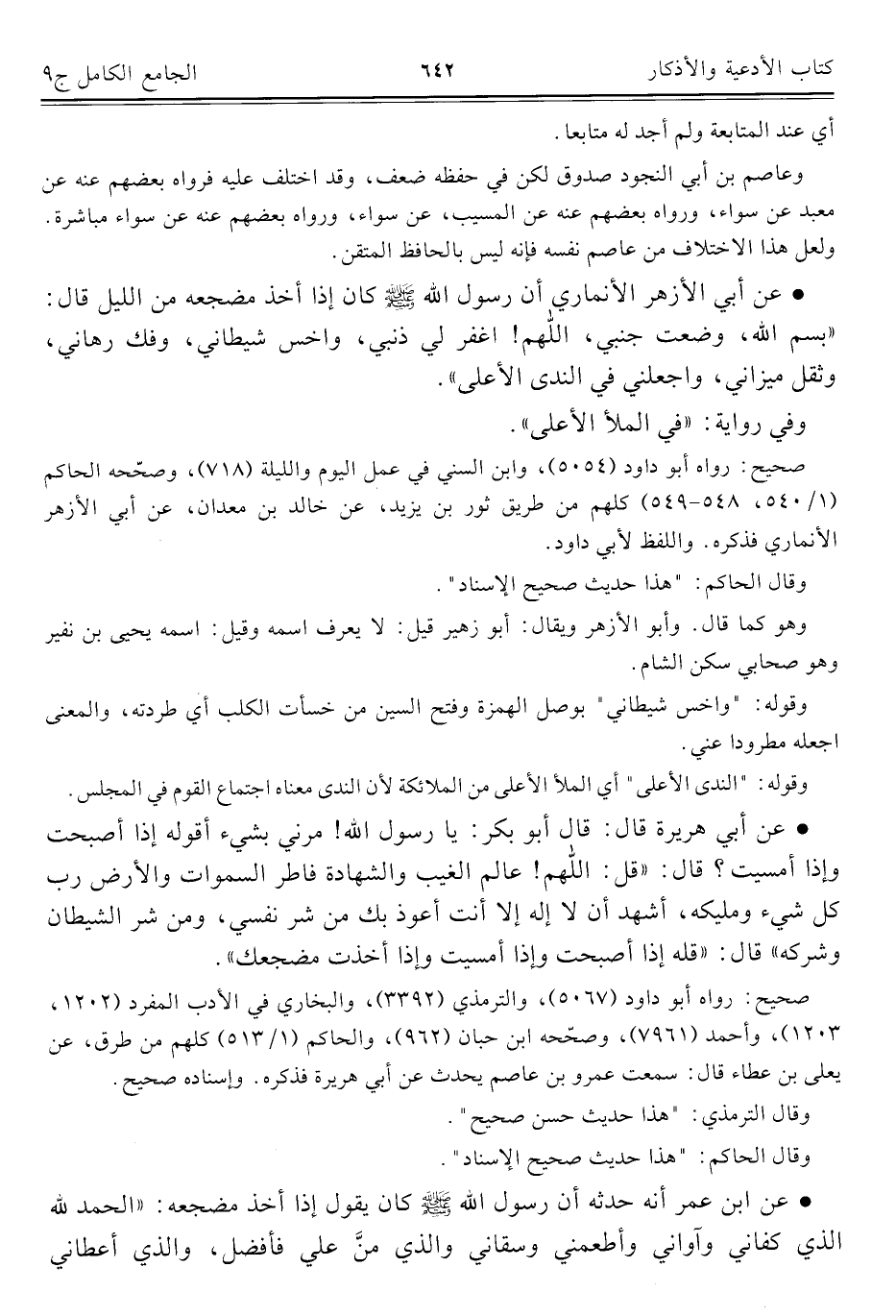 • عن أبي الأزهر الأنماري أن رسول الله - صلى الله عليه وسلم - كان إذا أخذ مضجعه من الليل قال: "بسم الله، وضعت جنبي، اللهم! اغفر لي ذنبي، واخس شيطاني، وفك رهاني، وثقل ميزاني، واجعلني في الندى الأعلى".