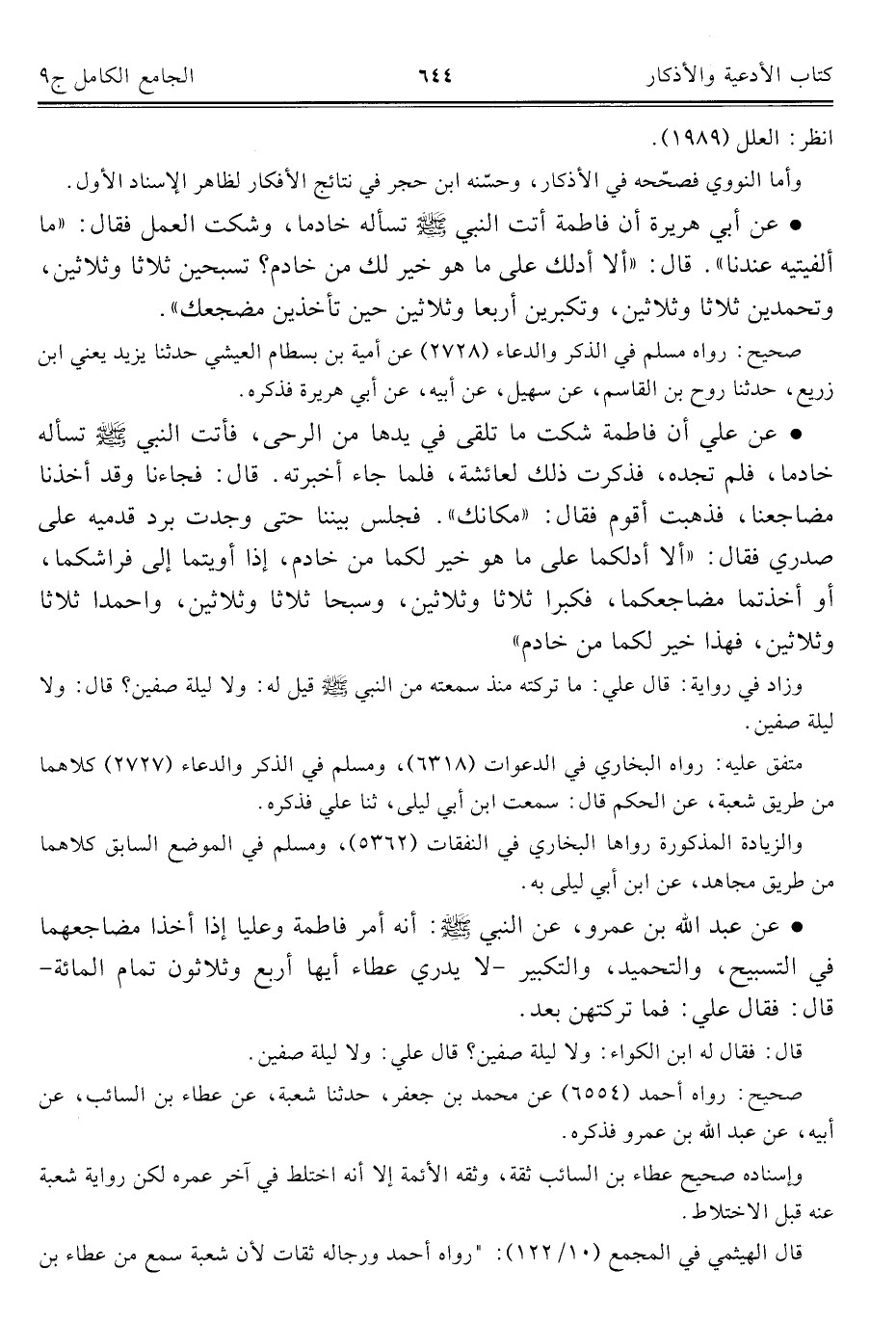 • عن عبد الله بن عمرو، عن النبي - صلى الله عليه وسلم -: أنه أمر فاطمة وعليا إذا أخذا مضاجعهما في التسبيح، والتحميد، والتكبير -لا يدري عطاء أيها أربع وثلاثون تمام المائة- قال: فقال علي: فما تركتهن بعد.