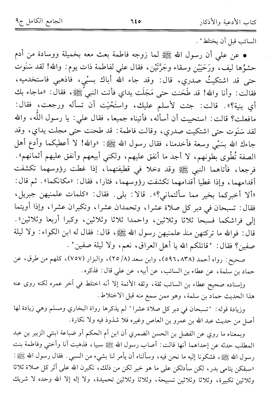وبمعناه ما روي عن الفضل بن الحسن الضمري أن ابن أم الحكم أو ضباعة ابنتي الزبير بن عبد المطلب حدثه عن إحداهما أنها قالت: أصاب رسول الله - صلى الله عليه وسلم - سبيا، فذهبت أنا وأختي وفاطمة بنت رسول الله - صلى الله عليه وسلم -، فشكونا إليه ما نحن فيه، وسألناه أن يأمر لنا بشيء من السبي. فقال رسول الله - صلى الله عليه وسلم -: "سبقكن يتامى بدر، لكن سأدلكن على ما هو خير لكن من ذلك، تكبرن الله على أثر كل صلاة ثلاثا وثلاثين تكبيرة، وثلاثا وثلاثين تسبيحة، وثلاثا وثلاثين تحميدة، ولا إله إلا الله وحده لا شريك