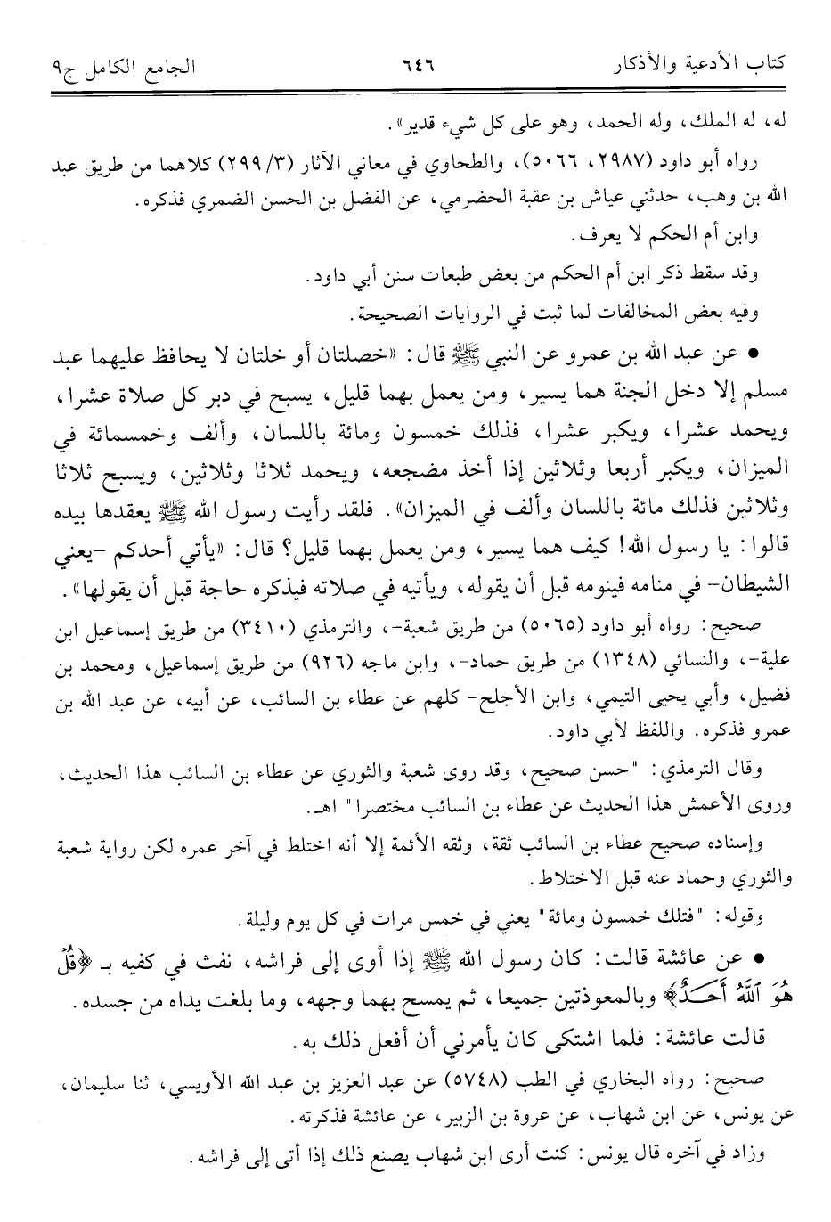 • عن عبد الله بن عمرو عن النبي - صلى الله عليه وسلم - قال: "خصلتان أو خلتان لا يحافظ عليهما عبد مسلم إلا دخل الجنة هما يسير، ومن يعمل بهما قليل، يسبح في دبر كل صلاة عشرا، ويحمد عشرا، ويكبر عشرا، فذلك خمسون ومائة باللسان، وألف وخمسمائة في الميزان، ويكبر أربعا وثلاثين إذا أخذ مضجعه، ويحمد ثلاثا وثلاثين، ويسبح ثلاثا وثلاثين فذلك مائة باللسان وألف في الميزان". فلقد رأيت رسول الله - صلى الله عليه وسلم -يعقدها بيده قالوا: يا رسول الله! كيف هما يسير، ومن يعمل بهما قليل؟ قال: "يأتي أحدكم -يعني الشيطان- في منامه فينومه قبل أن يقوله، ويأتيه في صلاته فيذكره حاجة قبل أن يقولها".