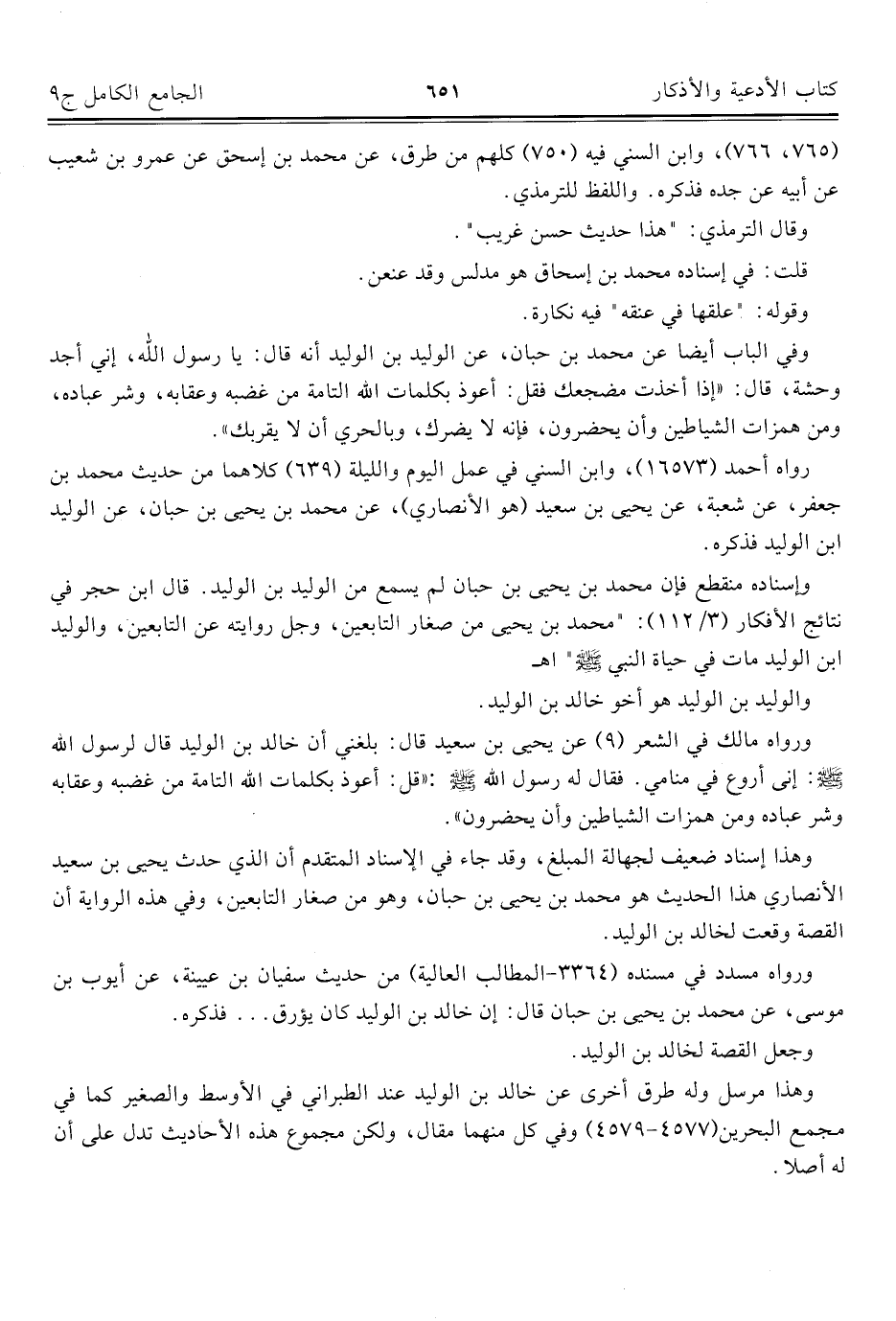 ورواه مالك في الشعر (٩) عن يحيى بن سعيد قال: بلغني أن خالد بن الوليد قال لرسول الله - صلى الله عليه وسلم -: إنى أروع في منامي. فقال له رسول الله - صلى الله عليه وسلم -: "قل: أعوذ بكلمات الله التامة من غضبه وعقابه وشر عباده ومن همزات الشياطين وأن يحضرون".