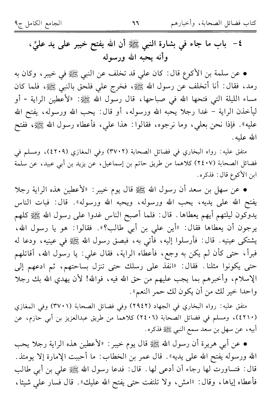 • عن سهل بن سعد أن رسول الله - صلى الله عليه وسلم - قال يوم خيبر: "لأعطين هذه الراية رجلا يفتح الله على يديه، يحب الله ورسوله، ويحبه الله ورسوله". قال: فبات الناس يدوكون ليلتهم أيهم يعطاها. قال: فلما أصبح الناس غدوا على رسول الله - صلى الله عليه وسلم - كلهم يرجون أن يعطاها فقال: "أين علي بن أبي طالب؟ ". فقالوا: هو يا رسول الله، يشتكى عينيه. قال: فأرسلوا إليه، فأتي به، فبصق رسول الله - صلى الله عليه وسلم - في عينيه، ودعا له فبرأ، حتى كأن لم يكن به وجع، فأعطاه الراية، فقال علي: يا رسول الله، أقاتلهم حتى يكونوا مثلنا. فقال: "انفذ على رسلك حتى تنزل بساحتهم، ثم ادعهم إلى الإسلام، وأخبرهم بما يجب عليهم من حق الله فيه، فوالله! لأن يهدي الله بك رجلا واحدا خير لك من أن يكون لك حمر النعم".