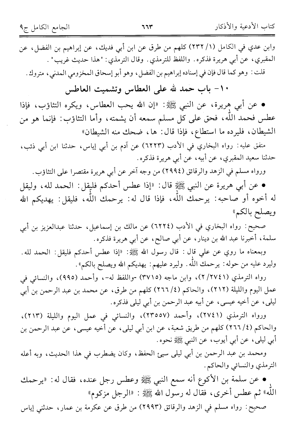 كتاب الجامع الكامل في الحديث الصحيح الشامل المرتب على أبواب الفقه (اسم الجزء: 9)