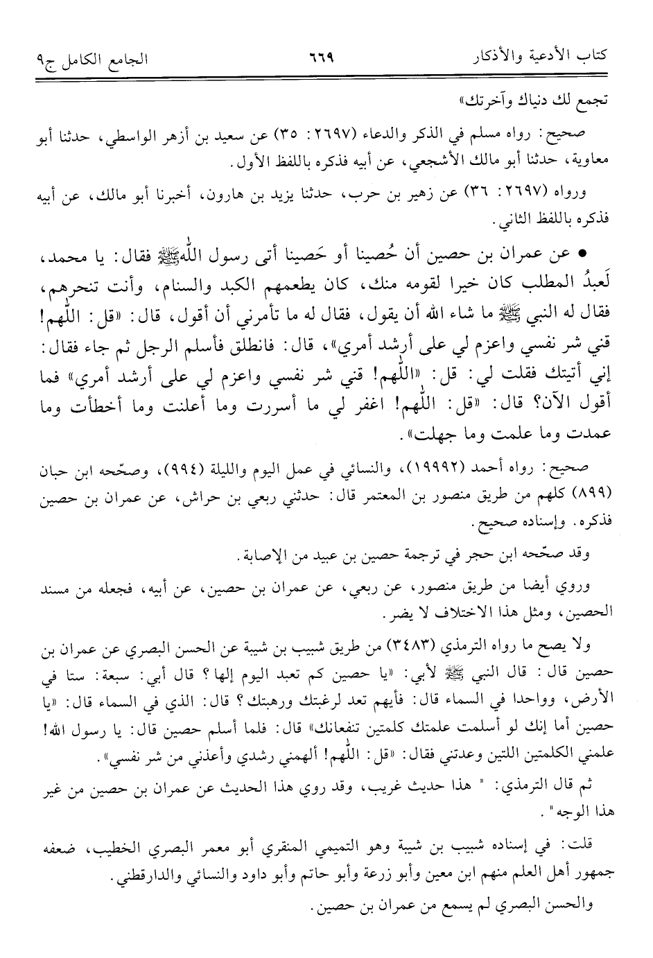 ولا يصح ما رواه الترمذي (٣٤٨٣) من طريق شبيب بن شيبة عن الحسن البصري عن عمران بن حصين قال: قال النبي - صلى الله عليه وسلم - لأبي: "يا حصين كم تعبد اليوم إلها؟ قال أبي: سبعة: ستا في الأرض، وواحدا في السماء قال: فأيهم تعد لرغبتك ورهبتك؟ قال: الذي في السماء قال: "يا حصين أما إنك لو أسلمت علمتك كلمتين تنفعانك" قال: فلما أسلم حصين قال: يا رسول الله! علمني الكلمتين اللتين وعدتني فقال: "قل: اللهم! ألهمني رشدي وأعذني من شر نفسي".