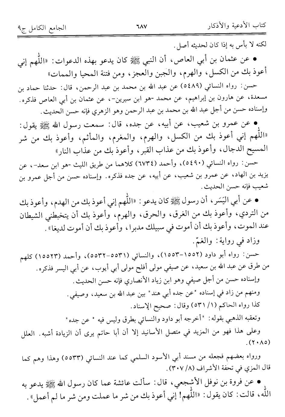 • عن عمرو بن شعيب، عن أبيه، عن جده، قال: سمعت رسول الله - صلى الله عليه وسلم - يقول: "اللهم إني أعوذ بك من الكسل، والهرم، والمغرم، والمأثم، وأعوذ بك من شر المسيح الدجال، وأعوذ بك من عذاب القبر، وأعوذ بك من عذاب النار".
