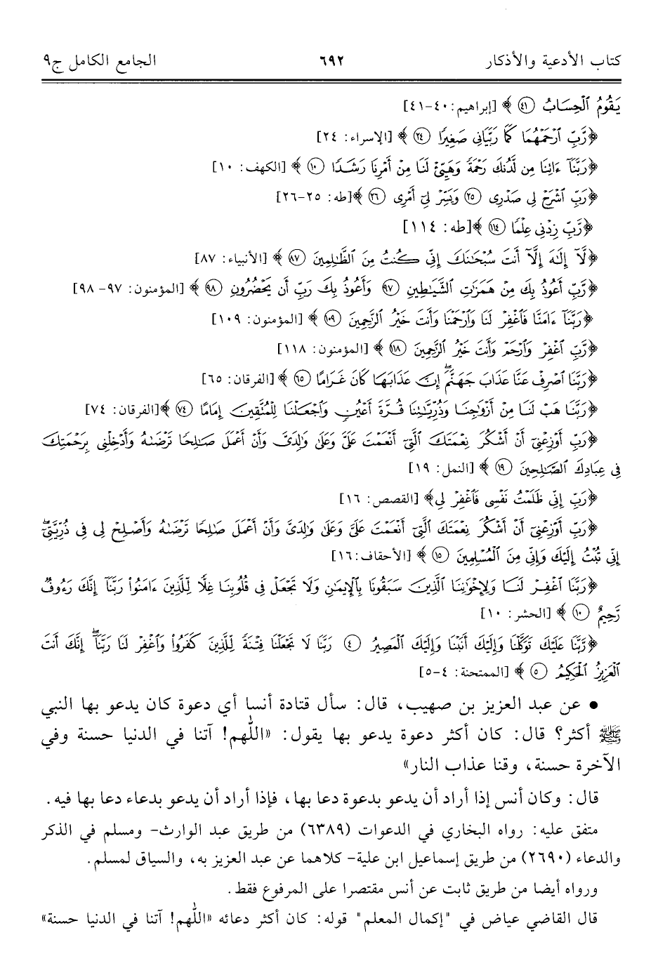 • عن عبد العزيز بن صهيب، قال: سأل قتادة أنسا أي دعوة كان يدعو بها النبي - صلى الله عليه وسلم - أكثر؟ قال: كان أكثر دعوة يدعو بها يقول: "اللهم! آتنا في الدنيا حسنة وفي الآخرة حسنة، وقنا عذاب النار".