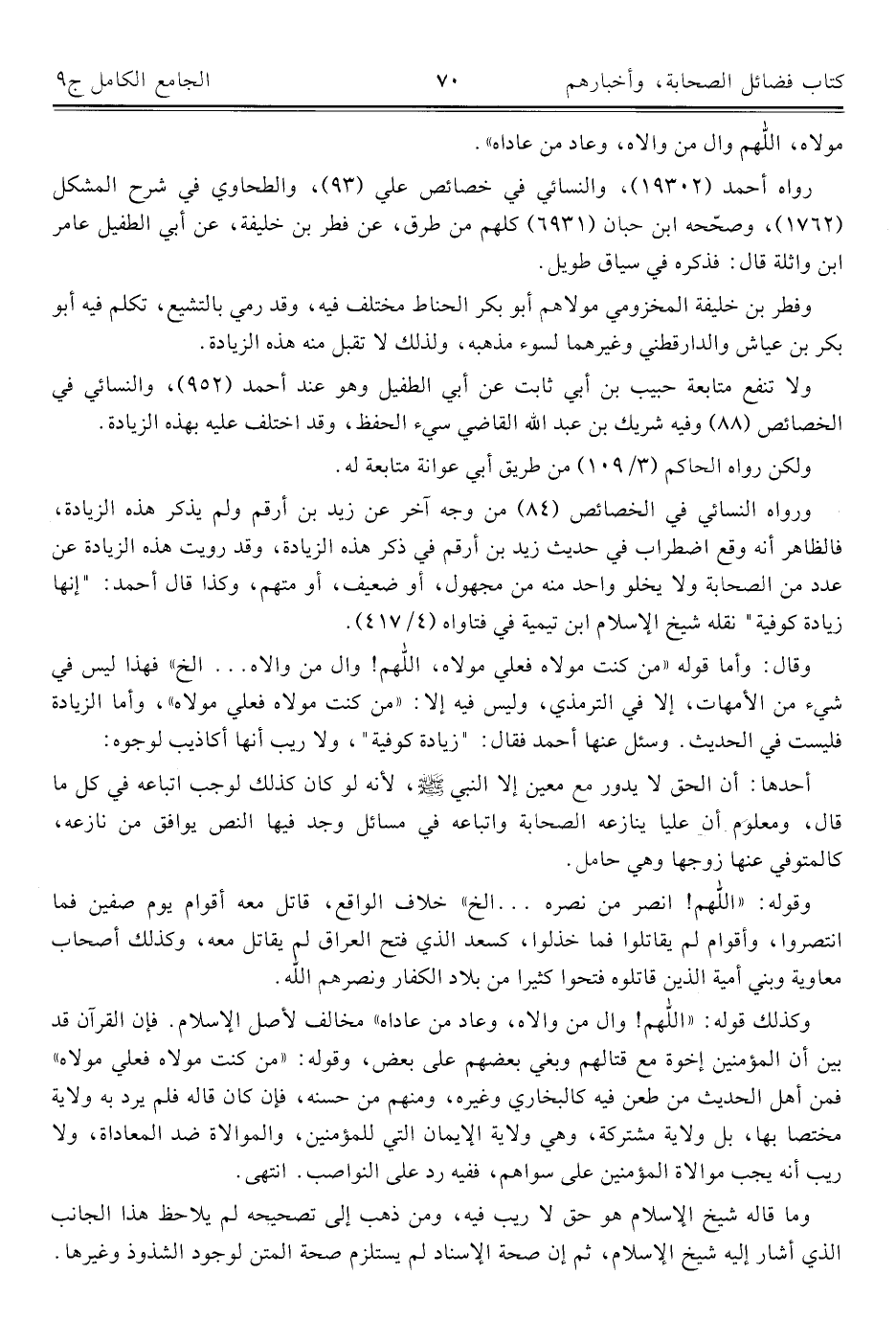 وكذلك قوله: "اللهم! وال من والاه، وعاد من عاداه" مخالف لأصل الإسلام. فإن القرآن قد بين أن المؤمنين إخوة مع قتالهم وبغي بعضهم على بعض، وقوله: "من كنت مولاه فعلي مولاه" فمن أهل الحديث من طعن فيه كالبخاري وغيره، ومنهم من حسنه، فإن كان قاله فلم يرد به ولاية مختصا بها، بل ولاية مشتركة، وهي ولاية الإيمان التي للمؤمنين، والموالاة ضد المعاداة، ولا ريب أنه يجب موالاة المؤمنين على سواهم، ففيه رد على النواصب. انتهى.