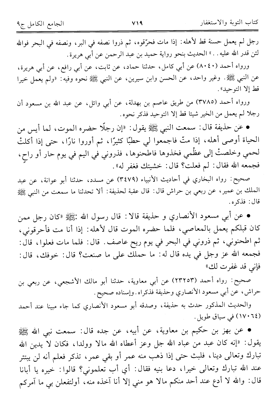 • عن أبي مسعود الأنصاري وحذيفة قالا: قال رسول الله: - صلى الله عليه وسلم - "كان رجل ممن كان قبلكم يعمل بالمعاصي، فلما حضره الموت قال لأهله: إذا أنا مت فأحرقوني، ثم اطحنوني، ثم ذروني في البحر في يوم ريح عاصف. قال: فلما مات فعلوا، قال: فجمعه الله عز وجل في يده قال له: ما حملك على ما صنعت؟ قال: خوفك، قال: فإني قد غفرت لك".