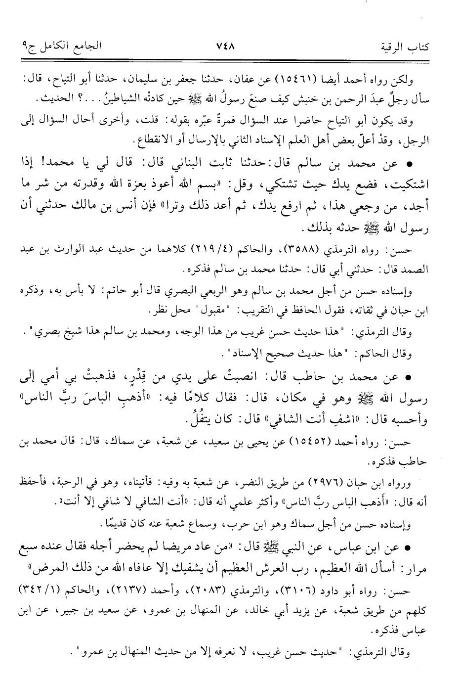 • عن محمد بن سالم قال: حدثنا ثابت البناني قال: قال لي يا محمد! إذا اشتكيت، فضع يدك حيث تشتكي، وقل: "بسم الله أعوذ بعزة الله وقدرته من شر ما أجد، من وجعي هذا، ثم ارفع يدك، ثم أعد ذلك وترا" فإن أنس بن مالك حدثني أن رسول الله - صلى الله عليه وسلم - حدثه بذلك.