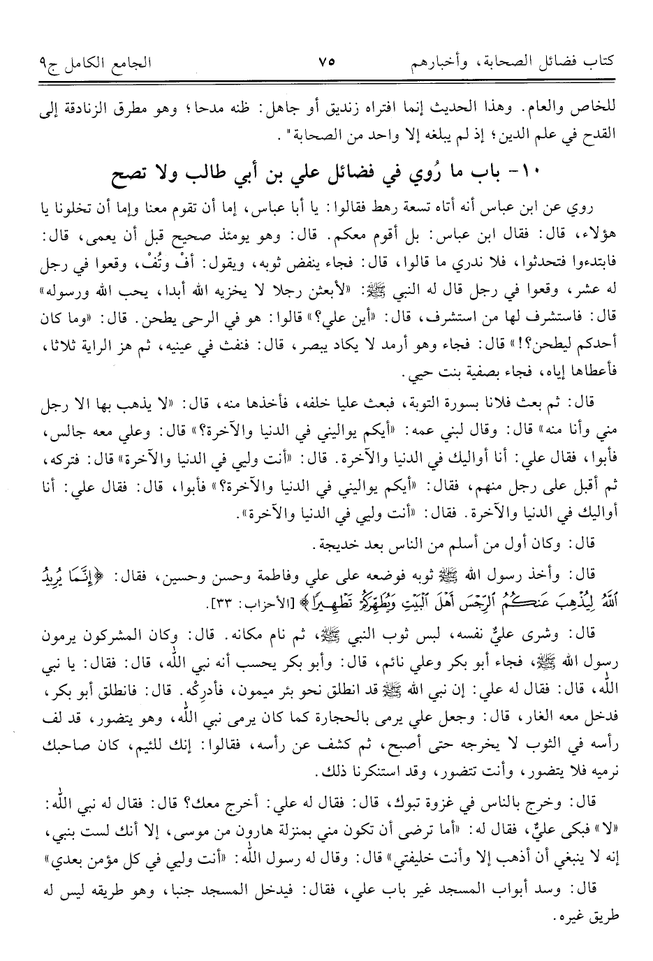 قال: وخرج بالناس في غزوة تبوك، قال: فقال له علي: أخرج معك؟ قال: فقال له نبي الله: "لا" فبكى عليٌّ، فقال له: "أما ترضى أن تكون مني بمنزلة هارون من موسى، إلا أنك لست بنبي، إنه لا ينبغي أن أذهب إلا وأنت خليفتي" قال: وقال له رسول الله: "أنت وليي في كل مؤمن بعدي" قال: وسد أبواب المسجد غير باب علي، فقال: فيدخل المسجد جنبا، وهو طريقه ليس له طريق غيره.