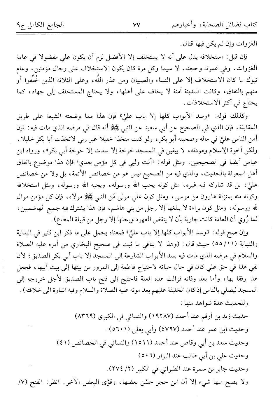 وإن صح قوله: "وسد الأبواب كلها إلا باب عليٍّ" فمعناه يحمل على ما ذكر ابن كثير في البداية والنهاية (١١/ ٥٥) حيث قال: (وهذا لا ينافي ما ثبت في صحيح البخاري من أمره عليه الصلاة والسلام في مرضه الذي مات فيه بسد الأبواب الشارعة إلى المسجد إلا باب أبي بكر الصديق؛ لأن نفي هذا في حق علي كان في حال حياته لاحتياج فاطمة إلى المرور من بيتها إلى بيت أبيها، فجعل هذا رفقا بها، وأما بعد وفاته فزالت هذه العلة فاحتيج إلى فتح باب الصديق لأجل خروجه إلى المسجد ليصلي بالناس إذ كان الخليفة عليهم بعد موته عليه الصلاة والسلام وفيه إشارة إلى خلافته).