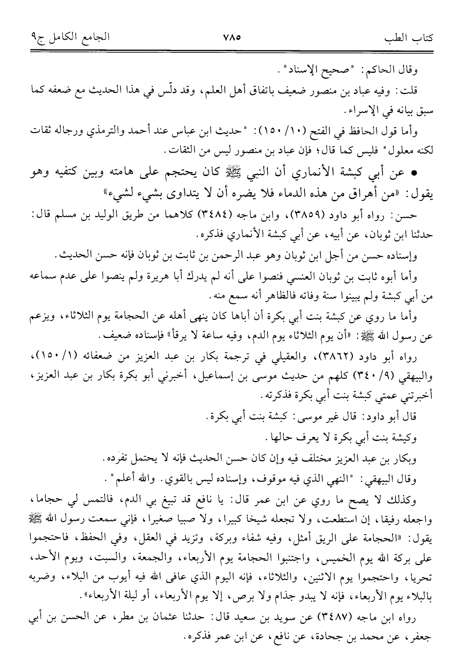 وأمّا ما رُوي عن كبشة بنت أبي بكرة أن أباها كان ينهى أهله عن الحجامة يوم الثلاثاء، ويزعم عن رسول الله - صلى الله عليه وسلم -: "أن يوم الثلاثاء يوم الدم، وفيه ساعة لا يرقأ" فإسناده ضعيف.