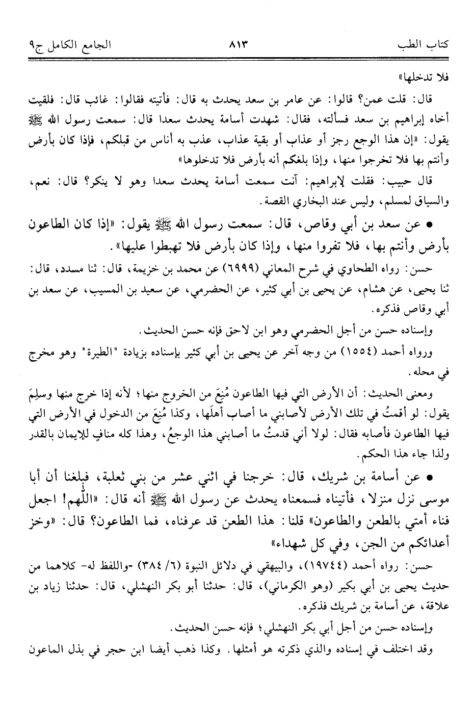 قال: قلت عمن؟ قالوا: عن عامر بن سعد يحدث به قال: فأتيته فقالوا: غائب قال: فلقيت أخاه إبراهيم بن سعد فسألته، فقال: شهدت أسامة يحدث سعدا قال: سمعتُ رسول الله صلى الله عليه وسلم يقول: "إن هذا الوجع رجز أو عذاب أو بقية عذاب، عذب به أناس من قبلكم، فإذا كان بأرض وأنتم بها فلا تخرجوا منها، وإذا بلغكم أنه بأرض فلا تدخلوها".