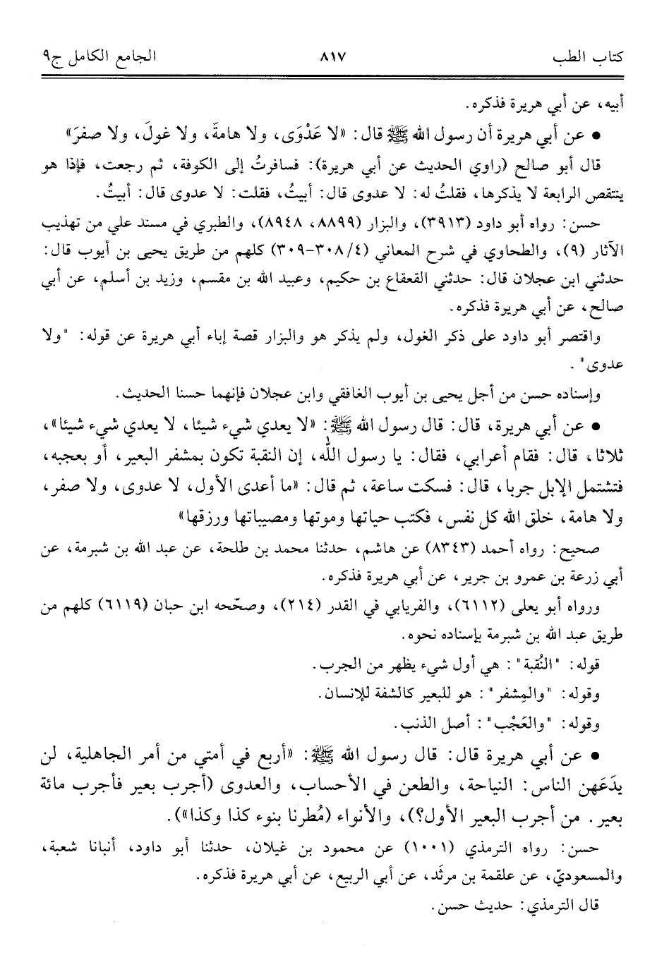 • عن أبى هريرة، قال: قال رسول الله - صلى الله عليه وسلم -: "لا يعدى شيء شيئًا، لا يعدي شيء شيئًا"، ثلاثًا، قال: فقام أعرابيّ، فقال: يا رسول الله، إن النقبة تكون بمشفر البعير، أو بعجبه، فتشتمل الإبل جربا، قال: فسكت ساعة، ثمّ قال: "ما أعدى الأوّل، لا عدوى، ولا صفر، ولا هامة، خلق الله كل نفس، فكتب حياتها وموتها ومصيباتها ورزقها".
