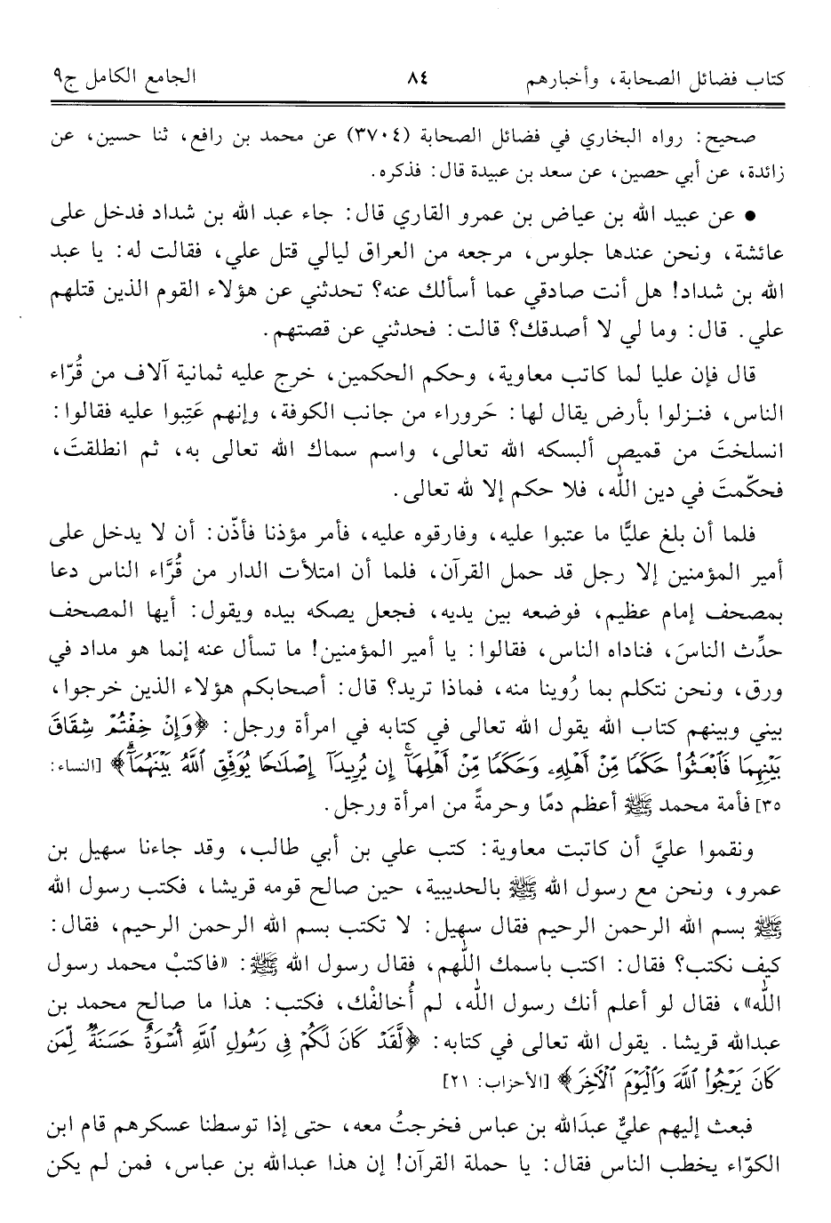 فلما أن بلغ عليًّا ما عتبوا عليه، وفارقوه عليه، فأمر مؤذنا فأذّن: أن لا يدخل على أمير المؤمنين إلا رجل قد حمل القرآن، فلما أن امتلأت الدار من قُرَّاء الناس دعا بمصحف إمام عظيم، فوضعه بين يديه، فجعل يصكه بيده ويقول: أيها المصحف حدِّث الناسَ، فناداه الناس، فقالوا: يا أمير المؤمنين! ما تسأل عنه إنما هو مداد في ورق، ونحن نتكلم بما رُوينا منه، فماذا تريد؟ قال: أصحابكم هؤلاء الذين خرجوا، بيني وبينهم كتاب الله يقول الله تعالى في كتابه في امرأة ورجل: {وَإِنْ خِفْتُمْ شِقَاقَ بَيْنِهِمَا فَابْعَثُوا حَكَمًا مِنْ أَهْلِهِ وَحَكَمًا مِنْ أَهْلِهَا إِنْ يُرِيدَا إِصْلَاحًا يُوَفِّقِ اللَّهُ بَيْنَهُمَا} [النساء: ٣٥]. فأمة محمد - صلى الله عليه وسلم - أعظم دمًا وحرمةً من امرأة ورجل.