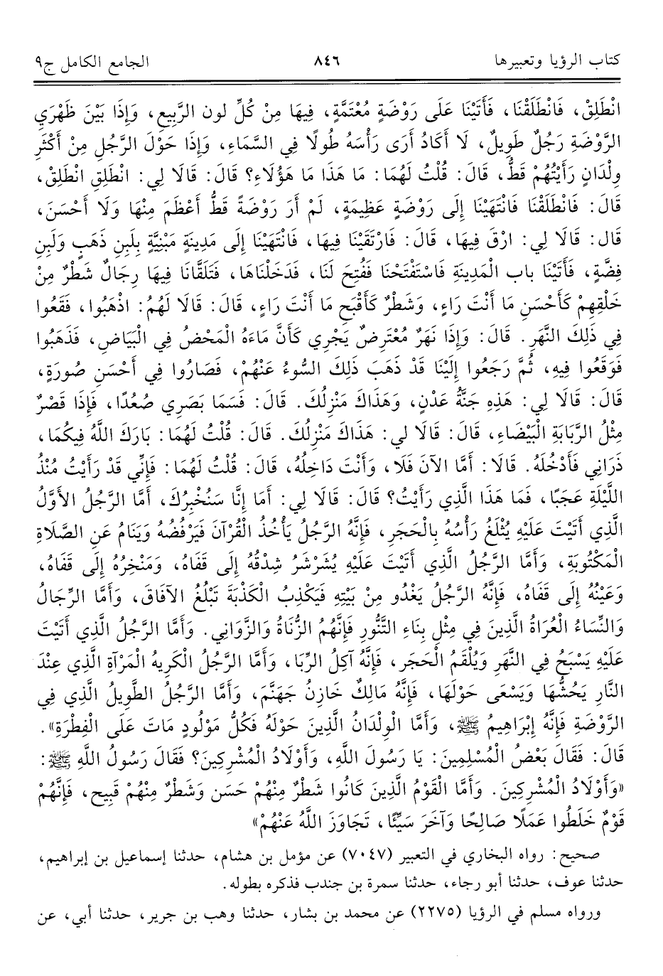 انْطَلِقْ، فَانْطَلَقْنَا، فَأَتَيْنَا عَلَى رَوْضَةٍ مُعْتَمَّةٍ، فِيهَا مِنْ كُلِّ لون الرَّبِيعِ، وَإِذَا بَيْنَ ظَهْرَيِ الرَّوْضَةِ رَجُلٌ طَوِيلٌ، لَا أَكَادُ أَرَى رَأْسَهُ طُولًا فِي السَّمَاءِ، وَإِذَا حَوْلَ الرَّجُلِ مِنْ أَكْثَرِ وِلْدَانٍ رَأَيْتُهُمْ قَطُّ، قَالَ: قُلْتُ لَهُمَا: مَا هَذَا مَا هَؤُلَاءِ؟ قَالَ: قَالَا لِي: انْطَلِقِ انْطَلِقْ، قَالَ: فَانْطَلَقْنَا فَانْتَهَيْنَا إِلَى رَوْضَةٍ عَظِيمَةٍ، لَمْ أَرَ رَوْضَةً قَطُّ أَعْظَمَ مِنْهَا وَلَا أَحْسَنَ، قَال: قَالَا لِي: ارْقَ فِيهَا، قَالَ: فَارْتَقَيْنَا فِيهَا، فَانْتَهَيْنَا إِلَى مَدِينَةٍ مَبْنِيَّةٍ بِلَبِنِ ذَهَبٍ وَلَبِنِ فِضَّةٍ، فَأَتَيْنَا باب الْمَدِينَةِ فَاسْتَفْتَحْنَا فَفُتِحَ لَنَا، فَدَخَلْنَاهَا، فَتَلَقَّانَا فِيهَا رِجَالٌ شَطْرٌ مِنْ خَلْقِهِمْ كَأَحْسَنِ مَا أَنْتَ رَاءٍ، وَشَطْرٌ كَأَقْبَحِ مَا أَنْتَ رَاءٍ، قَالَ: قَالَا لَهُمُ: اذْهَبُوا، فَقَعُوا فِي ذَلِكَ النَّهَرِ. قَالَ: وَإِذَا نَهَرٌ مُعْتَرِضٌ يَجْرِي كَأَنَّ مَاءَهُ الْمَحْضُ فِي الْبَيَاضِ، فَذَهَبُوا فَوَقَعُوا فِيهِ، ثُمَّ رَجَعُوا إِلَيْنَا قَدْ ذَهَبَ ذَلِكَ السُّوءُ عَنْهُمْ، فَصَارُوا فِي أَحْسَنِ صُورَةٍ، قَالَ: قَالَا لِي: هَذِهِ جَنَّةُ عَدْنٍ، وَهَذَاكَ مَنْزِلُكَ. قَالَ: فَسَمَا بَصَرِي صُعُدًا، فَإِذَا قَصْرٌ مِثْلُ الرَّبَابَةِ الْبَيْضَاءِ، قَالَ: قَالَا لي: هَذَاكَ مَنْزِلُكَ. قَالَ: قُلْتُ لَهُمَا: بَارَكَ اللَّهُ فِيكُمَا، ذَرَانِي فَأَدْخُلَهُ. قَالَا: أَمَّا الآنَ فَلَا، وَأَنْتَ دَاخِلُهُ، قَالَ: قُلْتُ لَهُمَا: فَإِنِّي قَدْ رَأَيْتُ مُنْذُ اللَّيْلَةِ عَجَبًا، فَمَا هَذَا الَّذِي رَأَيْتُ؟ قَالَ: قَالَا لِي: أَمَا إِنَّا سَنُخْبِرُكَ، أَمَّا الرَّجُلُ الأَوَّلُ الَّذِي أَتَيْتَ عَلَيْهِ يُثْلَغُ رَأْسُهُ بِالْحَجَرِ، فَإِنَّهُ الرَّجُلُ يَأْخُذُ الْقُرْآنَ فَيَرْفُضُهُ وَيَنَامُ عَنِ الصَّلَاةِ الْمَكْتُوبَةِ، وَأَمَّا الرَّجُلُ الَّذِي أَتَيْتَ عَلَيْهِ يُشَرْشَرُ شِدْقُهُ إِلَى قَفَاهُ، وَمَنْخِرُهُ إِلَى قَفَاهُ، وَعَيْنُهُ إِلَى قَفَاهُ، فَإِنَّهُ الرَّجُلُ يَغْدُو مِنْ بَيْتِهِ فَيَكْذِبُ الْكَذْبَةَ تَبْلُغُ الآفَاقَ، وَأَمَّا الرِّجَالُ وَالنِّسَاءُ الْعُرَاةُ الَّذِينَ فِي مِثْلِ بِنَاءِ التَّنُّورِ فَإِنَّهُمُ الزُّنَاةُ وَالزَّوَانِي. وَأَمَّا الرَّجُلُ الَّذِي أَتَيْتَ عَلَيْهِ يَسْبَحُ فِي النَّهَرِ وَيُلْقَمُ الْحَجَر، فَإِنَّهُ آكِلُ الرِّبَا، وَأَمَّا الرَّجُلُ الْكَرِيهُ الْمَرْآةِ الَّذِي عِنْدَ النَّارِ يَحُشُّهَا وَيَسْعَى حَوْلَهَا، فَإِنَّهُ مَالِكٌ خَازِنُ جَهَنَّمَ، وَأَمَّا الرَّجُلُ الطَّوِيلُ الَّذِي فِي الرَّوْضةِ فَإِنَّهُ إِبْرَاهِيمُ -صلى اللَّه عليه وسلم-، وَأَمَّا الْوِلْدَانُ الَّذِينَ حَوْلَهُ فَكُلُّ مَوْلُودٍ مَاتَ عَلَى الْفِطْرَةِ". قَالَ: فَقَالَ بَعْضُ الْمُسْلِمِين: يَا رَسُولَ اللَّهِ، وَأَوْلَادُ الْمُشْرِكِينَ؟ فَقَالَ رَسُولُ اللَّهِ -صلى اللَّه عليه وسلم-: "وَأَوْلَادُ الْمُشْرِكِينَ. وَأَمَّا الْقَوْمُ الَّذِينَ كَانُوا شَطْرٌ مِنْهُمْ حَسَن وَشَطْرٌ مِنْهُمْ قَبِيح، فَإِنَّهُمْ قَوْمٌ خَلَطُوا عَمَلًا صالِحًا وَآخَرَ سَيِّئًا، تَجَاوَزَ اللَّهُ عَنْهُمْ".