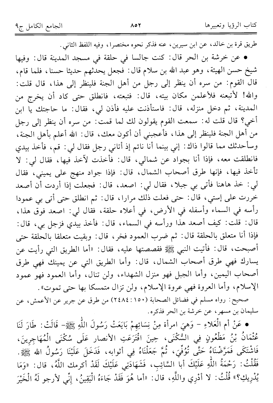 • عن خرشة بن الحر قال: كنت جالسا في حلقة في مسجد المدينة قال: وفيها شيخ حسن الهيئة، وهو عبد اللَّه بن سلام قال: فجعل يحدثهم حديثا حسنا، فلما قام، قال القوم: من سره أن ينظر إلى رجل من أهل الجنة فلينظر إلى هذا، قال قلت: واللَّه! لأتبعنه فلأعلمن مكان بيته، قال: فتبعته، فانطلق حتى كاد أن يخرج من المدينة، ثم دخل منزله، قال: فاستأذنت عليه فأذن لي، فقال: ما حاجتك يا ابن أخي؟ قال قلت له: سمعت القوم يقولون لك لما قمت: من سره أن ينظر إلى رجل من أهل الجنة فلينظر إلى هذا، فأعجبني أن أكون معك، قال: اللَّه أعلم بأهل الجنة، وسأحدثك مما قالوا ذاك: إني بينما أنا نائم إذ أتاني رجل فقال لي: قم، فأخذ بيدي فانطلقت معه، فإذا أنا بجواد عن شمالي، قال: فأخذت لآخذ فيها، فقال لي: لا تأخذ فيها، فإنها طرق أصحاب الشمال، قال: فإذا جواد منهج على يميني، فقال لي: خذ هاهنا فأتى بي جبلا، فقال لي: اصعد، قال: فجعلت إذا أردت أن أصعد خررت على إستي، قال: حتى فعلت ذلك مرارا، قال: ثم انطلق حتى أتى بي عمودا رأسه في السماء وأسفله في الأرض، في أعلاه حلقة، فقال لي: اصعد فوق هذا، قال: قلت: كيف أصعد هذا ورأسه في السماء، قال: فأخذ بيدي فزجل بي، قال: فإذا أنا متعلق بالحلقة قال: ثم ضرب العمود فخر، قال: وبقيت متعلقا بالحلقة حتى أصبحت، قال: فأتيت النبي -صلى اللَّه عليه وسلم- فقصصتها عليه، فقال: "أما الطريق التي رأيت عن يسارك فهي طرق أصحاب الشمال، قال: وأما الطريق التي عن يمينك فهي طرق أصحاب اليمين، وأما الجبل فهو منزل الشهداء، ولن تنال، وأما العمود فهو عمود الإسلام، وأما العروة فهي عروة الإسلام، ولن تزال متمسكا بها حتى تموت".