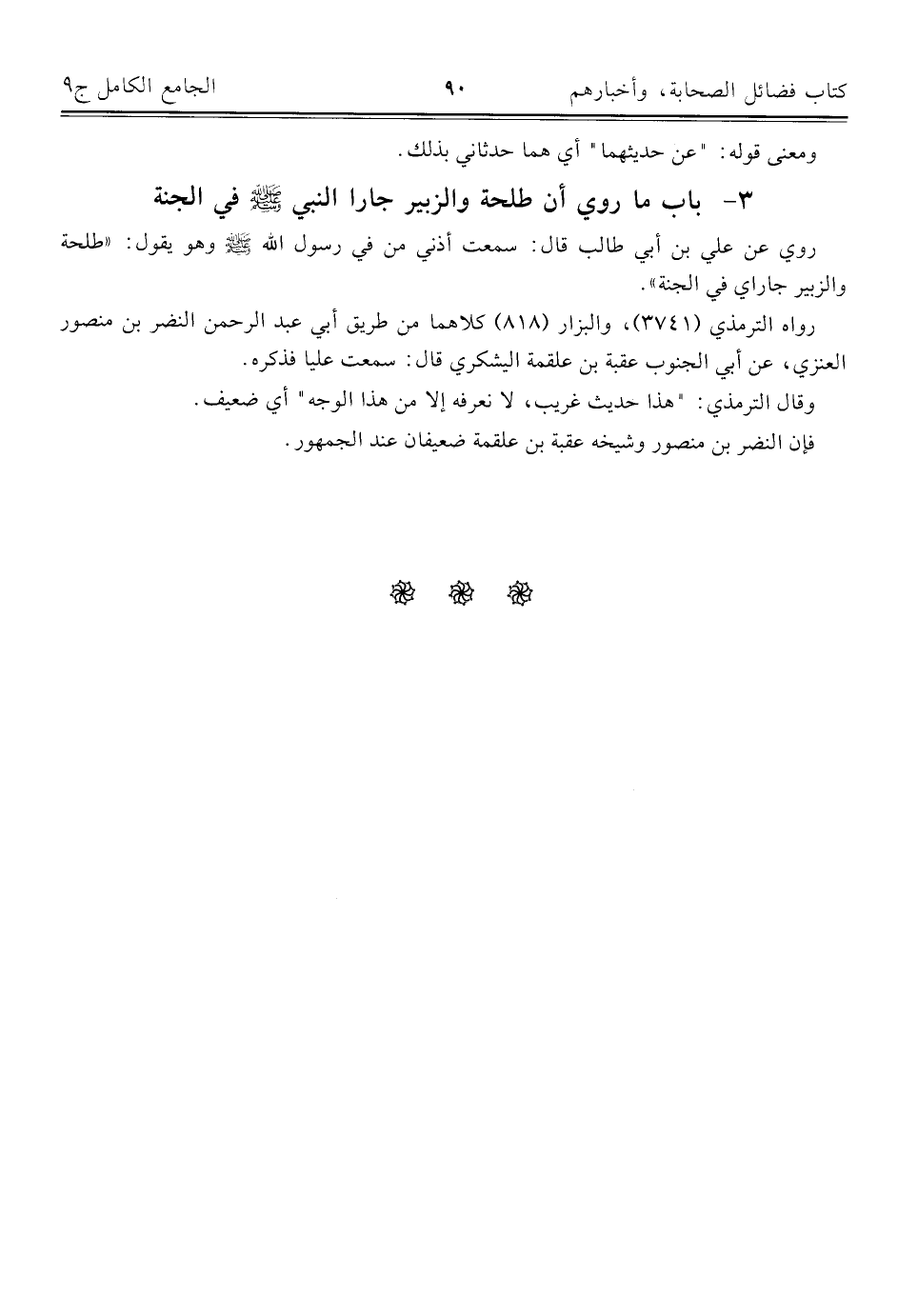 ٣ - باب ما روي أن طلحة والزبير جارا النبي - صلى الله عليه وسلم - في الجنة