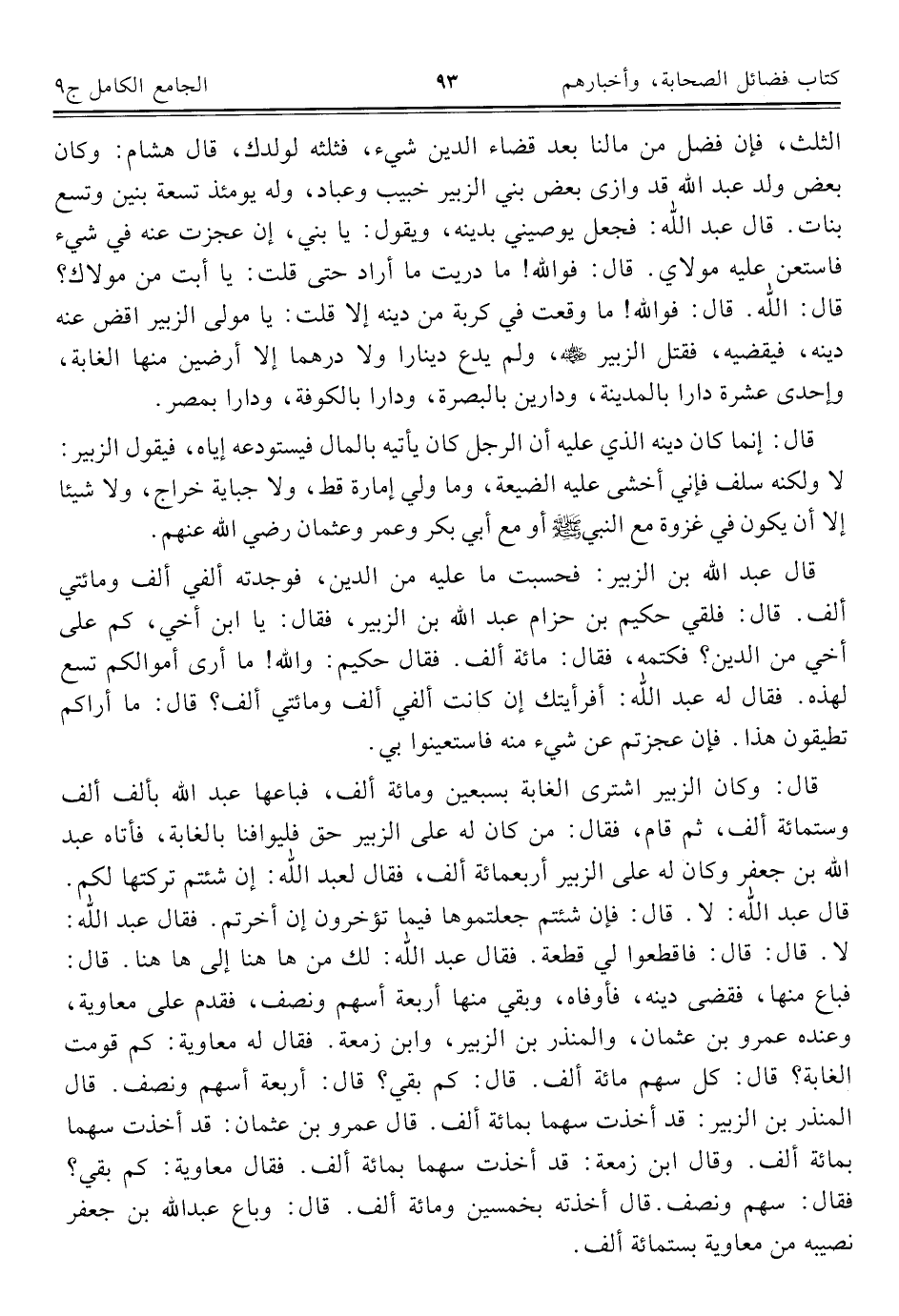 قال عبد الله بن الزبير: فحسبت ما عليه من الدين، فوجدته ألفي ألف ومائتي ألف. قال: فلقي حكيم بن حزام عبد الله بن الزبير، فقال: يا ابن أخي، كم على أخي من الدين؟ فكتمه، فقال: مائة ألف. فقال حكيم: والله! ما أرى أموالكم تسع لهذه. فقال له عبد الله: أفرأيتك إن كانت ألفي ألف ومائتي ألف؟ قال: ما أراكم تطيقون هذا. فإن عجزتم عن شيء منه فاستعينوا بي.