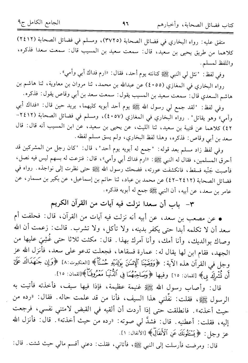 ٣ - باب أن سعدا نزلت فيه آيات من القرآن الكريم