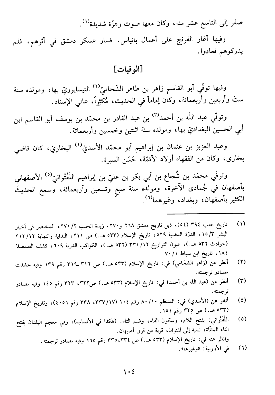 وَفِيهَا تُوُفِّيَ أَبُو الْقَاسِمِ زَاهِرُ بْنُ طَاهِرٍ الشَّحَّامِيُّ النَّيْسَابُورِي بِهَا، وَمَوْلِدُهُ سَنَةَ سِتٍّ وَأَرْبَعِينَ وَأَرْبَعِمِائَةٍ، وَكَانَ إِمَامًا فِي الْحَدِيثِ، مُكْثِرًا عَالِيَ الْإِسْنَادِ.