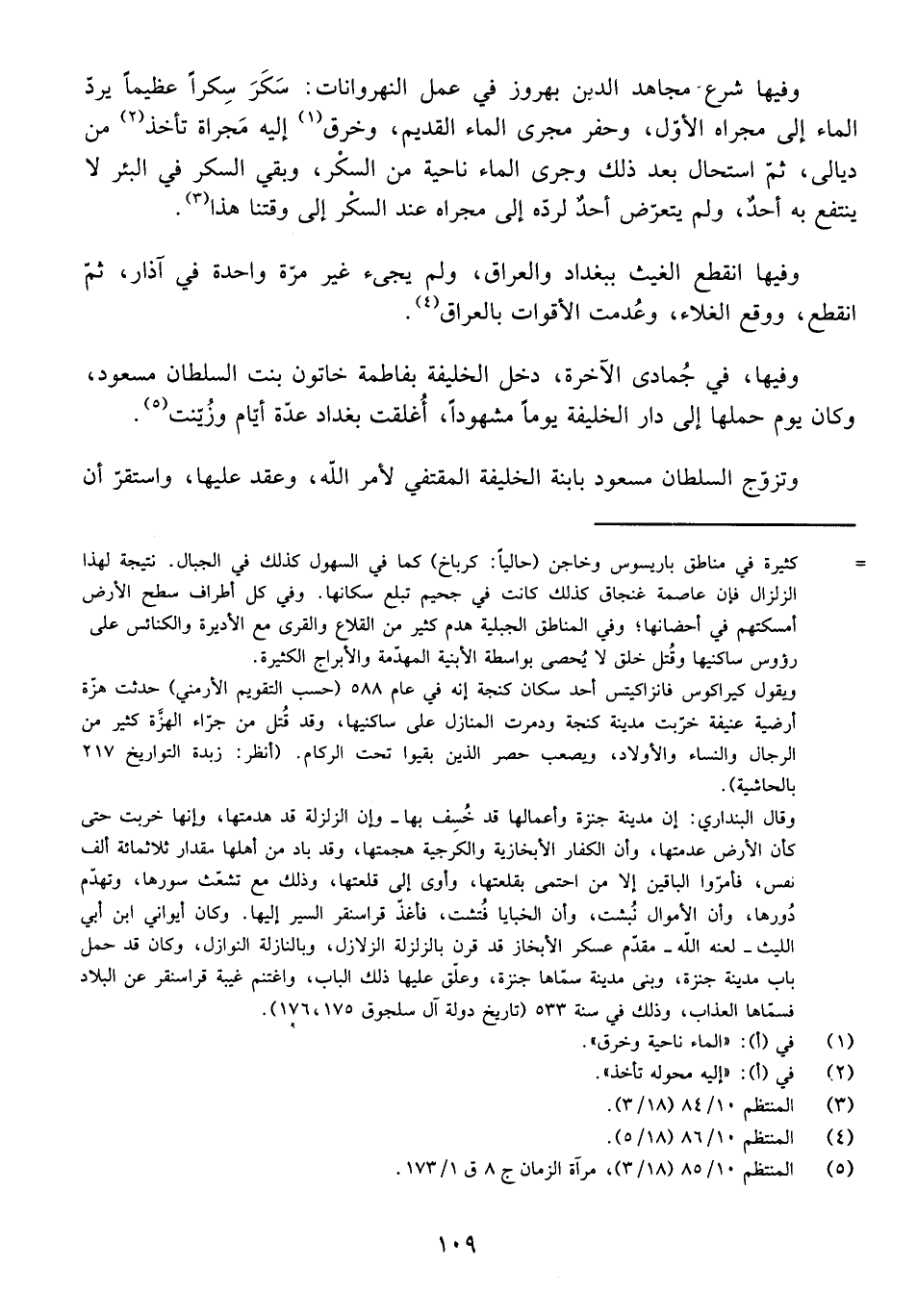 وَفِيهَا شَرَعَ مُجَاهِدُ الدِّينِ بَهْرُوزَ فِي عَمَلِ النَّهْرَوَانَاتِ: سَكَرَ سِكْرًا عَظِيمًا يَرُدُّ الْمَاءَ إِلَى مَجْرَاهُ الْأَوَّلِ، وَحَفَرَ مَجْرَى الْمَاءِ الْقَدِيمِ، وَخَرَقَ إِلَيْهِ مَجْرَاةً تَأْخُذُ مِنْ دِيَالَى ثُمَّ اسْتَحَالَ بَعْدَ ذَلِكَ، وَجَرَى الْمَاءُ نَاحِيَةً مِنَ السِّكْرِ، وَبَقِيَ السِّكْرُ فِي الْبِئْرِ لَا يَنْتَفِعُ بِهِ أَحَدٌ، وَلَمْ يَتَعَرَّضْ أَحَدٌ لِرَدِّهِ إِلَى مَجْرَاهُ عِنْدَ السِّكْرِ إِلَى وَقْتِنَا هَذَا.