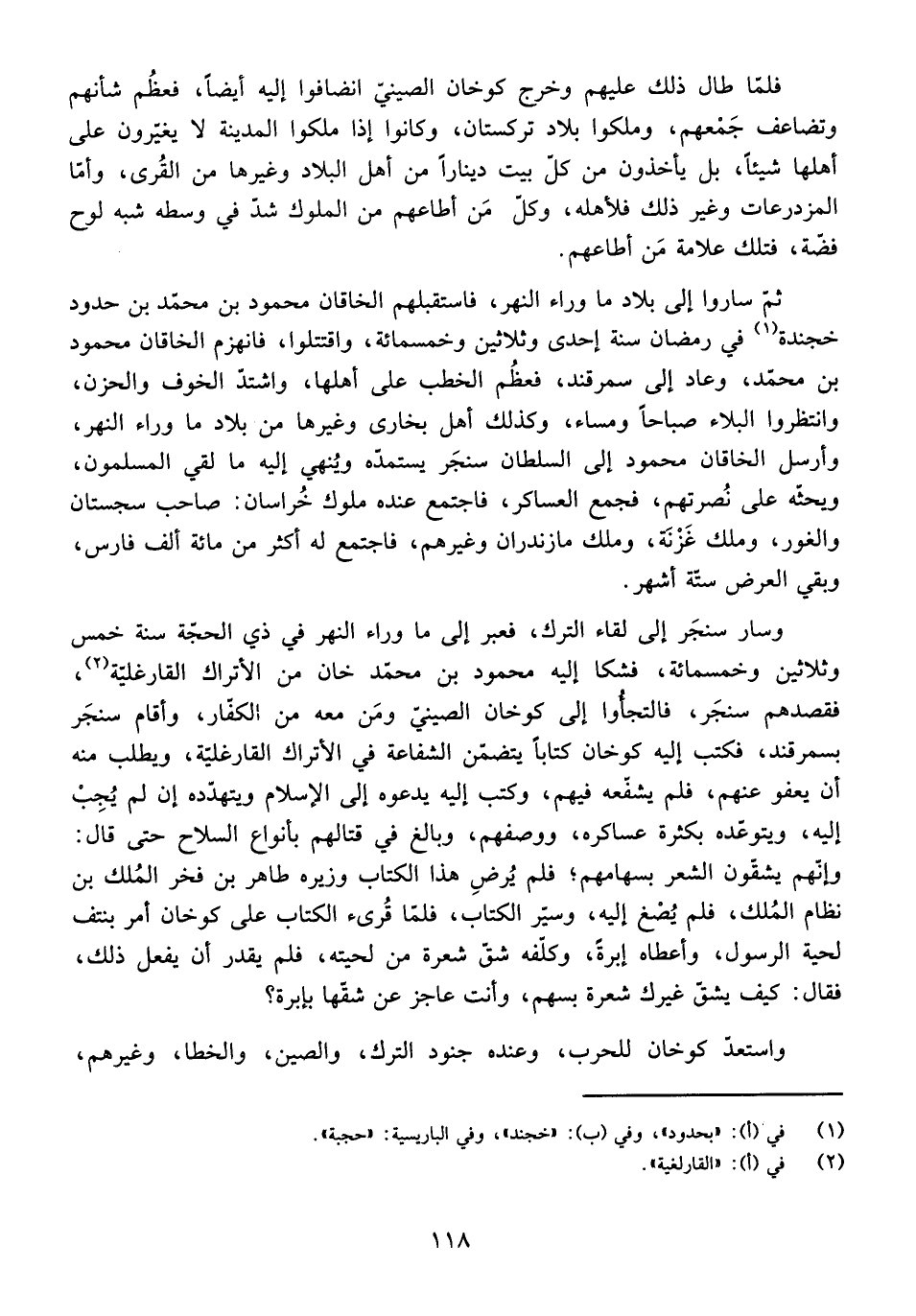 ثُمَّ سَارُوا إِلَى بِلَادِ مَا وَرَاءَ النَّهْرِ، فَاسْتَقْبَلَهُمُ الْخَاقَانُ مَحْمُودُ بْنُ مُحَمَّدِ بْنِ حُدُودِ خَجَنْدَةَ فِي رَمَضَانَ سَنَةَ إِحْدَى وَثَلَاثِينَ وَخَمْسِمَائَةٍ، وَاقْتَتَلُوا، فَانْهَزَمَ الْخَاقَانُ مَحْمُودُ بْنُ مُحَمَّدٍ وَعَادَ إِلَى سَمَرْقَنْدَ، فَعَظُمَ الْخَطْبُ عَلَى أَهْلِهَا، وَاشْتَدَّ الْخَوْفُ وَالْحُزْنُ، وَانْتَظَرُوا الْبَلَاءَ صَبَاحًا وَمَسَاءً، وَكَذَلِكَ أَهْلُ بُخَارَى وَغَيْرِهَا مِنْ بِلَادِ مَا وَرَاءَ النَّهْرِ، وَأَرْسَلَ الْخَاقَانُ مَحْمُودٌ إِلَى السُّلْطَانِ سَنْجَرَ يَسْتَمِدُّهُ وَيُنْهِي إِلَيْهِ مَا لَقِيَ الْمُسْلِمُونَ، وَيَحُثُّهُ عَلَى نُصْرَتِهِمْ، فَجَمَعَ الْعَسَاكِرَ، فَاجْتَمَعَ عِنْدَهُ مُلُوكُ خُرَاسَانَ: صَاحِبُ سِجِسْتَانَ، وَالْغَوْرِ، وَمَلِكُ غَزْنَةَ، وَمَلِكُ مَازَنْدَرَانَ، وَغَيْرُهُمْ، فَاجْتَمَعَ لَهُ أَكْثَرُ مِنْ مِائَةِ أَلْفِ فَارِسٍ، وَبَقِيَ الْعَرْضُ سِتَّةَ أَشْهُرٍ.