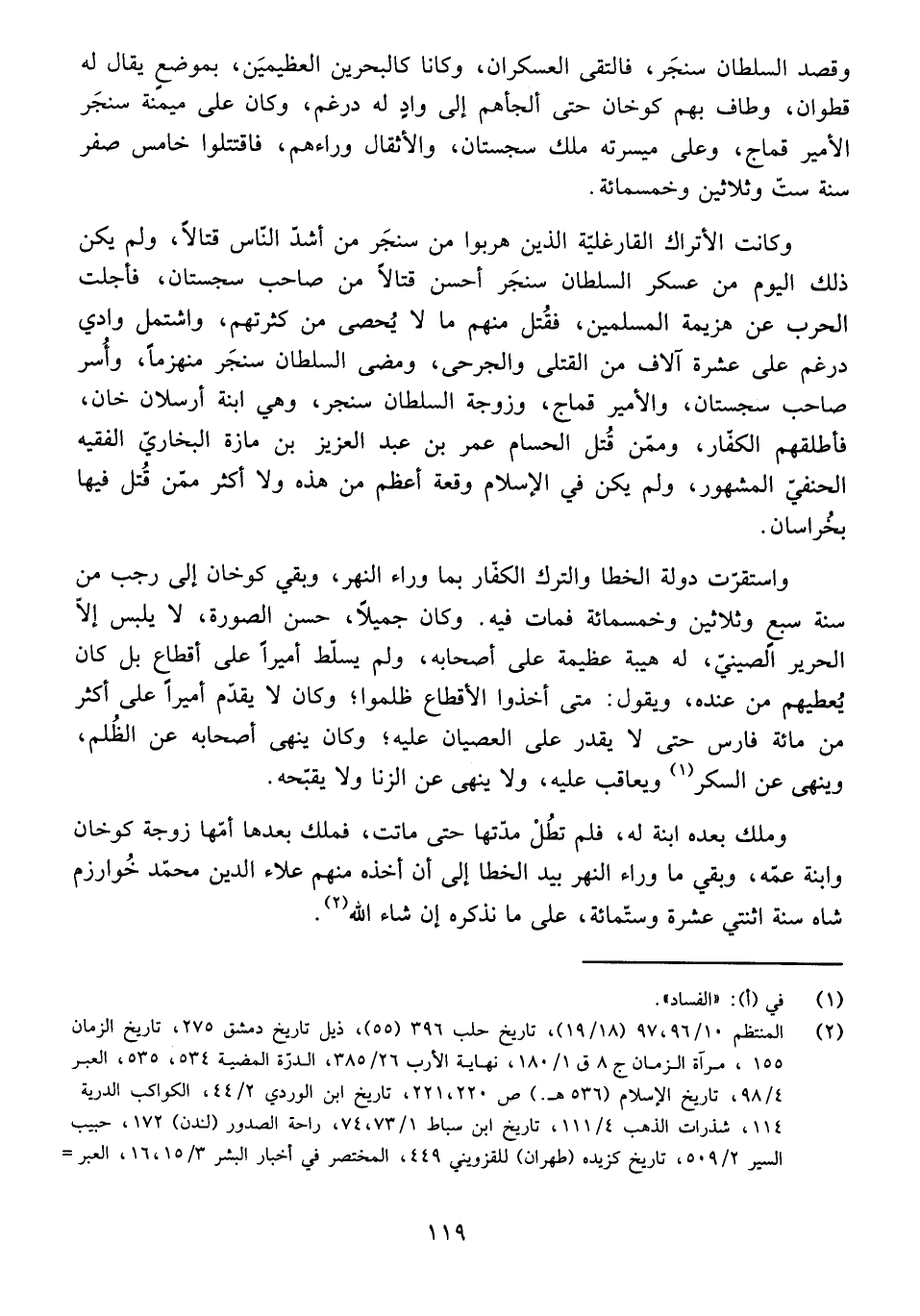 وَمَلَكَ بَعْدَهُ ابْنَةٌ لَهُ فَلَمْ تَطُلْ مُدَّتُهَا حَتَّى مَاتَتْ، فَمَلَكَ بَعْدَهَا أُمُّهَا زَوْجَةُ كُوخَانْ وَابْنَةُ عَمِّهِ، وَبَقِيَ مَا وَرَاءَ النَّهْرِ بِيَدِ الْخِطَا إِلَى أَنْ أَخْذَهُ مِنْهُمْ عَلَاءُ الدِّينِ مُحَمَّدُ خُوَارَزْمُ شَاهْ سَنَةَ اثْنَتَيْ عَشْرَةَ وَسِتِّمِائَةٍ، عَلَى مَا نَذْكُرُهُ إِنْ شَاءَ اللَّهُ.