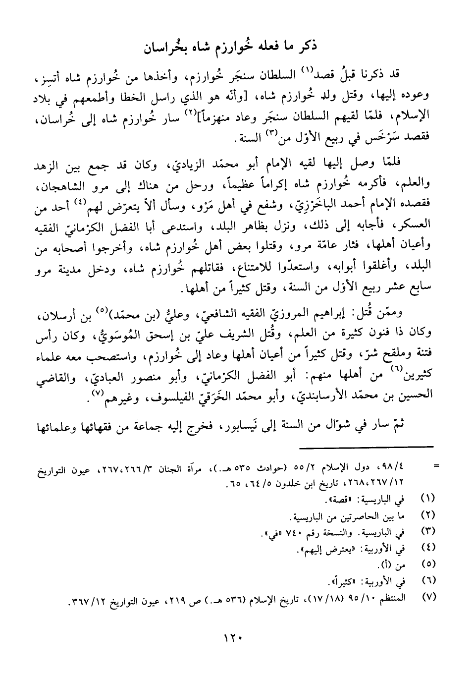 فَلَمَّا وَصَلَ إِلَيْهَا لَقِيَهُ الْإِمَامُ أَبُو مُحَمَّدٍ الزِّيَادَيُّ، وَكَانَ قَدْ جَمَعَ بَيْنَ الزُّهْدِ وَالْعِلْمِ، فَأَكْرَمَهُ خُوَارَزْمُ شَاهْ إِكْرَامًا عَظِيمًا، وَرَحَلَ مِنْ هُنَاكَ إِلَى مَرْوَ الشَّاهْجَانُ، فَقَصَدَهُ الْإِمَامُ أَحْمَدُ الْبَاخَرْزِيُّ، وَشَفَعَ فِي أَهْلِ مَرْوَ، وَسَأَلَ أَلَّا يَتَعَرَّضَ لَهُمْ أَحَدٌ مِنَ الْعَسْكَرِ، فَأَجَابَهُ إِلَى ذَلِكَ، وَنَزَلَ بِظَاهِرِ الْبَلَدِ، وَاسْتَدْعَى أَبَا الْفَضْلِ الْكِرْمَانِيَّ الْفَقِيهَ وَأَعْيَانَ أَهْلِهَا، فَثَارَ عَامَّةُ مَرْوَ، وَقَتَلُوا بَعْضَ أَهْلِ خُوَارَزْمَ شَاهْ، وَأَخْرَجُوا أَصْحَابَهُ مِنَ الْبَلَدِ، وَأَغْلَقُوا أَبْوَابَهُ، وَاسْتَعَدُّوا لِلِامْتِنَاعِ، فَقَاتَلَهُمْ خُوَارَزْمُ شَاهْ، وَدَخَلَ مَدِينَةَ مَرْوَ سَابِعَ عَشَرَ رَبِيعٍ الْأَوَّلِ مِنَ السَّنَةِ، وَقَتَلَ كَثِيرًا مِنْ أَهْلِهَا.